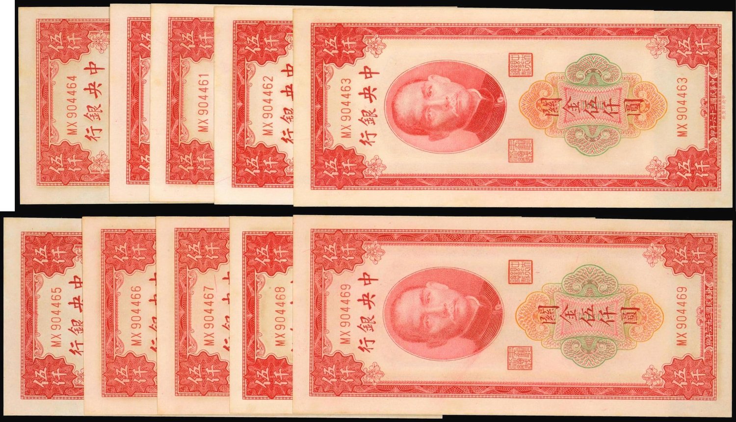 Central Bank of China,consecutive run of 10 x 5000 CGU, 1947,vertical format, red and multicolour, Sun Yat Sen at upper centre, reverse red, bank building at upper centre,