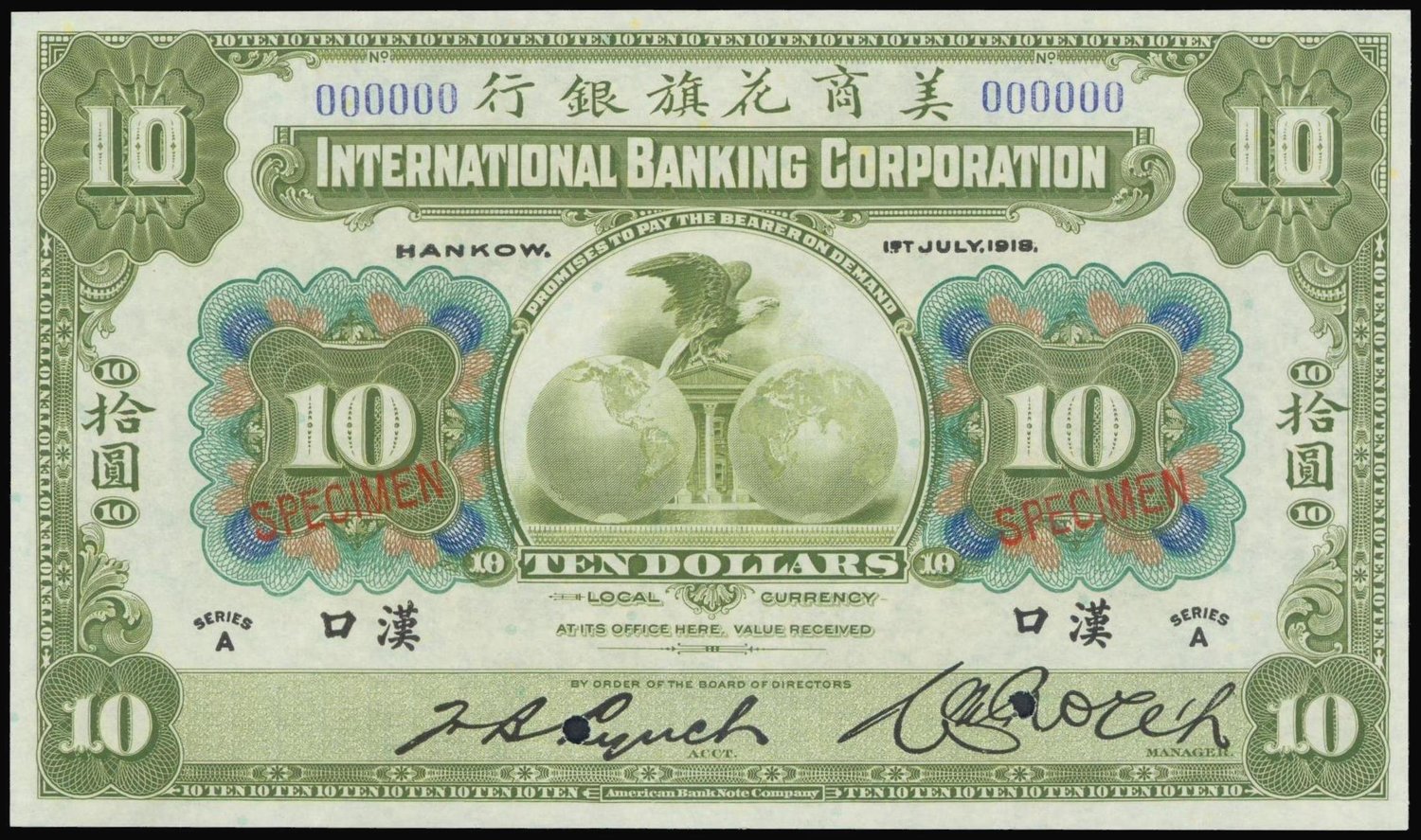 International Banking Corporation,$10, 1918, Hankow, specimen,green and multicolour, eagle standing above globes, value left and right,reverse green,