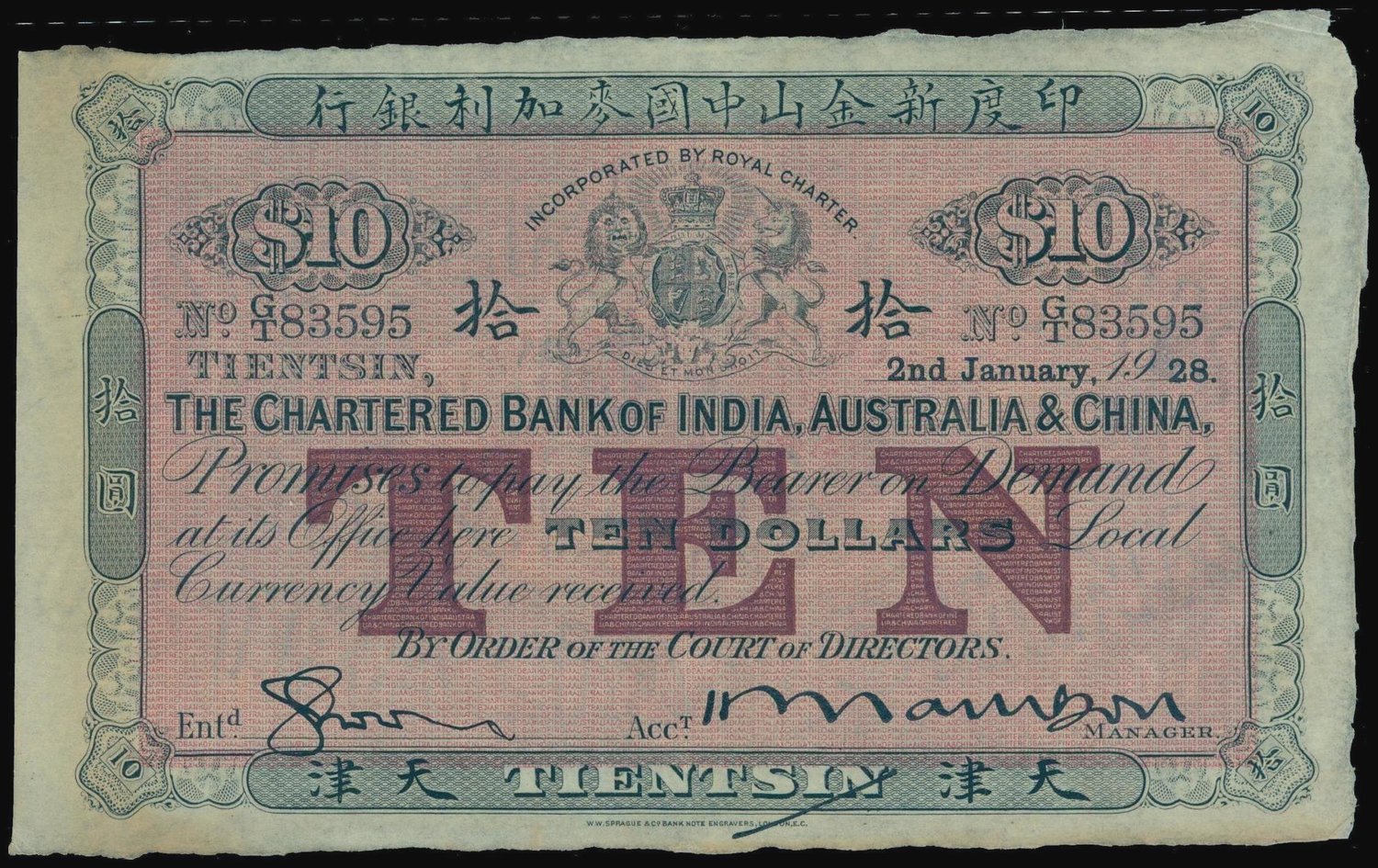 The Chartered Bank of India, Australia and China, $10, Tientsin, 1928, serial number GF 83595, dark green on pink-purple, royal crest top centre, '$10' either side, 'TEN' in dark purple underprint, two handsigned signatures, reverse black,
