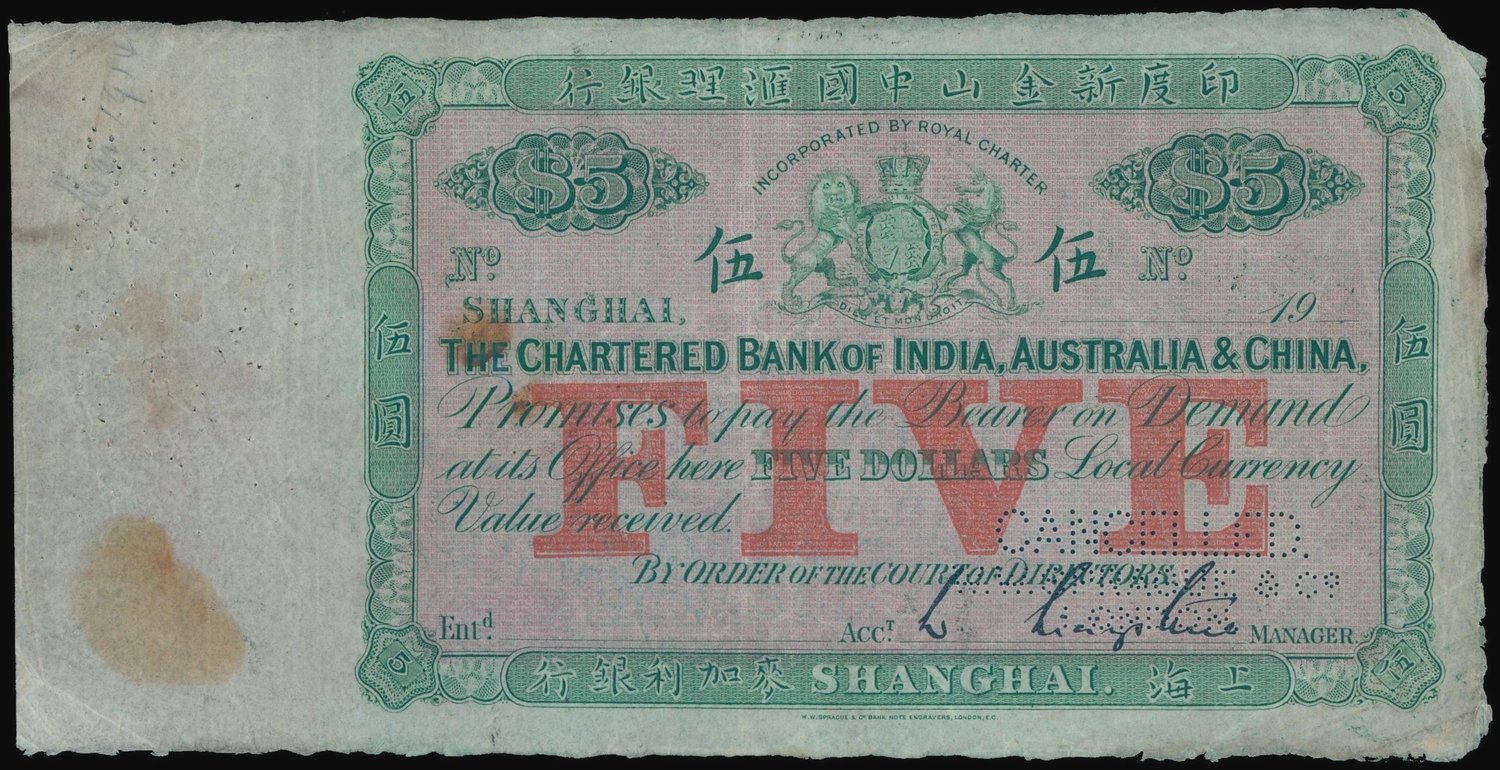 The Chartered Bank of India, Australia and China, $5, remainder, Shanghai, 1914-1927, green and pink and red, royal crest top centre, '$5' either side, FIVE in red letter at centre, perforated words bottom right, reverse green,