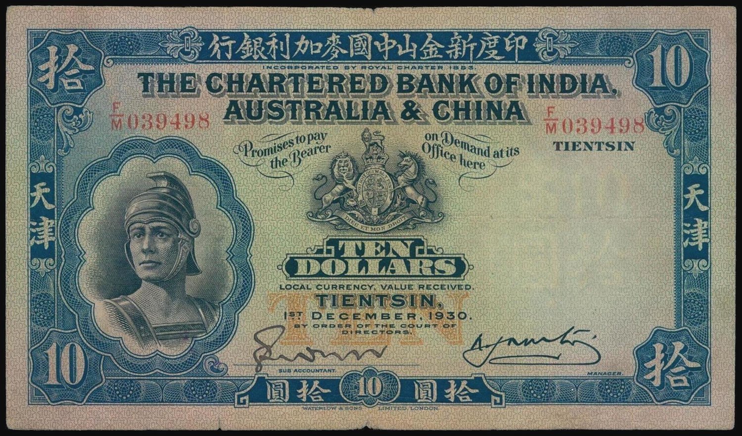 The Chartered Bank of India, Australia and China, $10, Tientsin, 1930, serial number F/M 039498, blue, black and multicolour, Roman soldier at left, watermark showing the denomination at right, handsigned signature at bottom left, reverse blue, sailing junk right of centre,