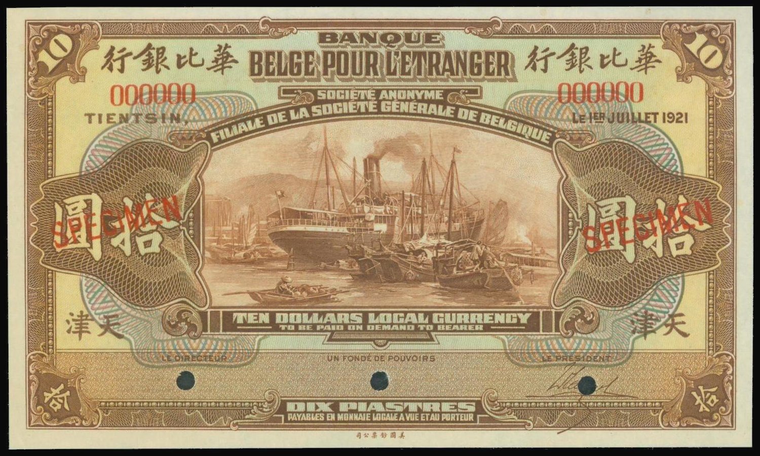 Banque Belge Pour L'Etranger, $10, specimen, Tienstsin, 1921, serial number 000000, brown and multicolour, steam ship and sampans by dockside at centre, reverse brown, coat of arms at centre,