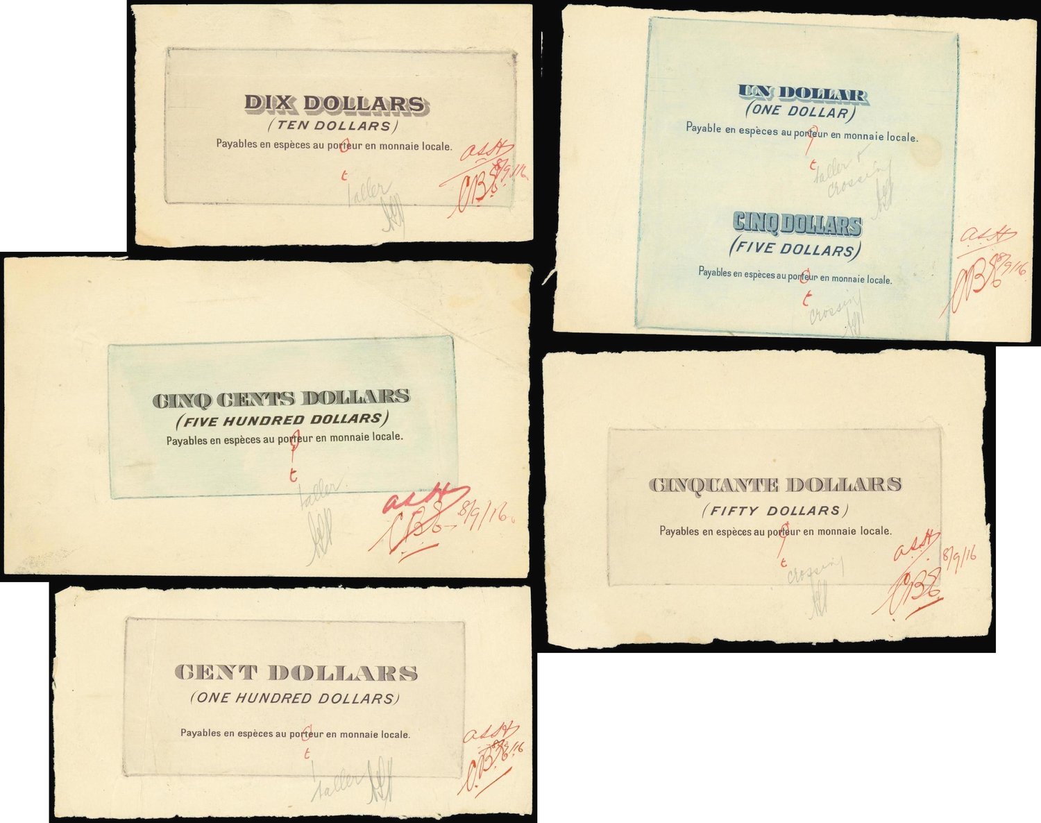 Banque Industrielle de Chine, set of 5 archival proof pieces stating the denomination, $1, $5, $10, $50, $100 and $500, (the $1 and $5 are together), signed and dated 1916,