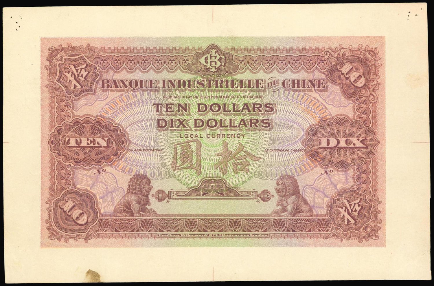 Banque Industrielle de Chine, a uniface colour trial proof of the obverse for $10, without place name, series of 1914, red-purple, green and multicolour, ornamental lions bottom left and right,
