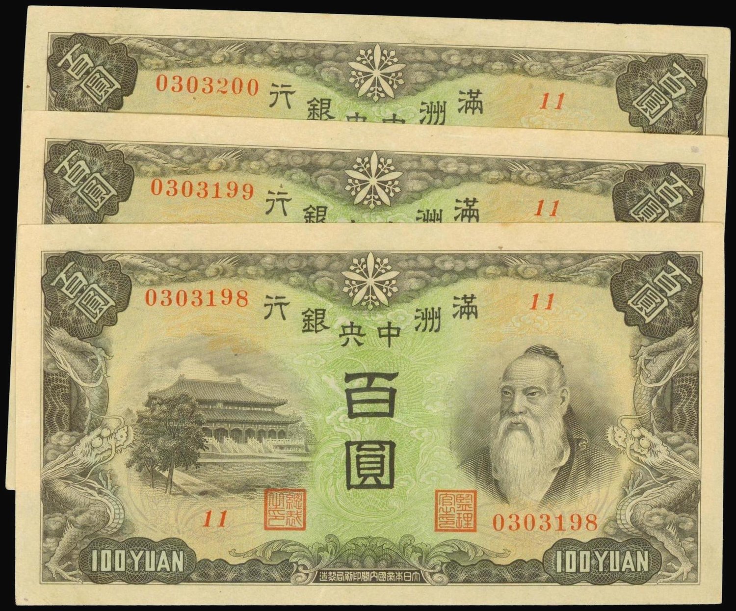 Central Bank of Manchukuo,consecutive run of three 100 yuan, ND(1944), serial number 0303198-200,black on green and yellow underprint, temple at left, old man at right, reverse blue, sheeps at centre, watermark of bank name in Chinese,