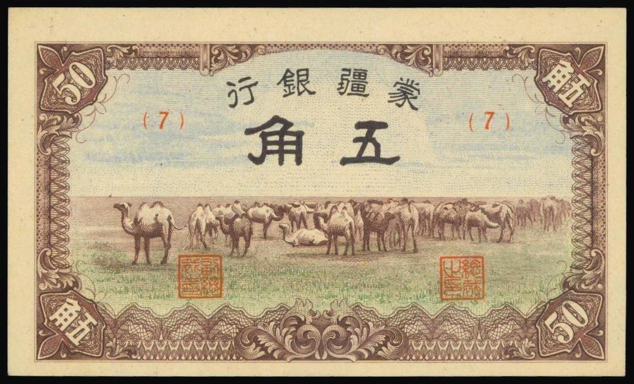 Mengchiang Bank,5 chiao, ND(1940), block number 7,brown on light blue and green, herd of camels at centre,reverse grey blue,