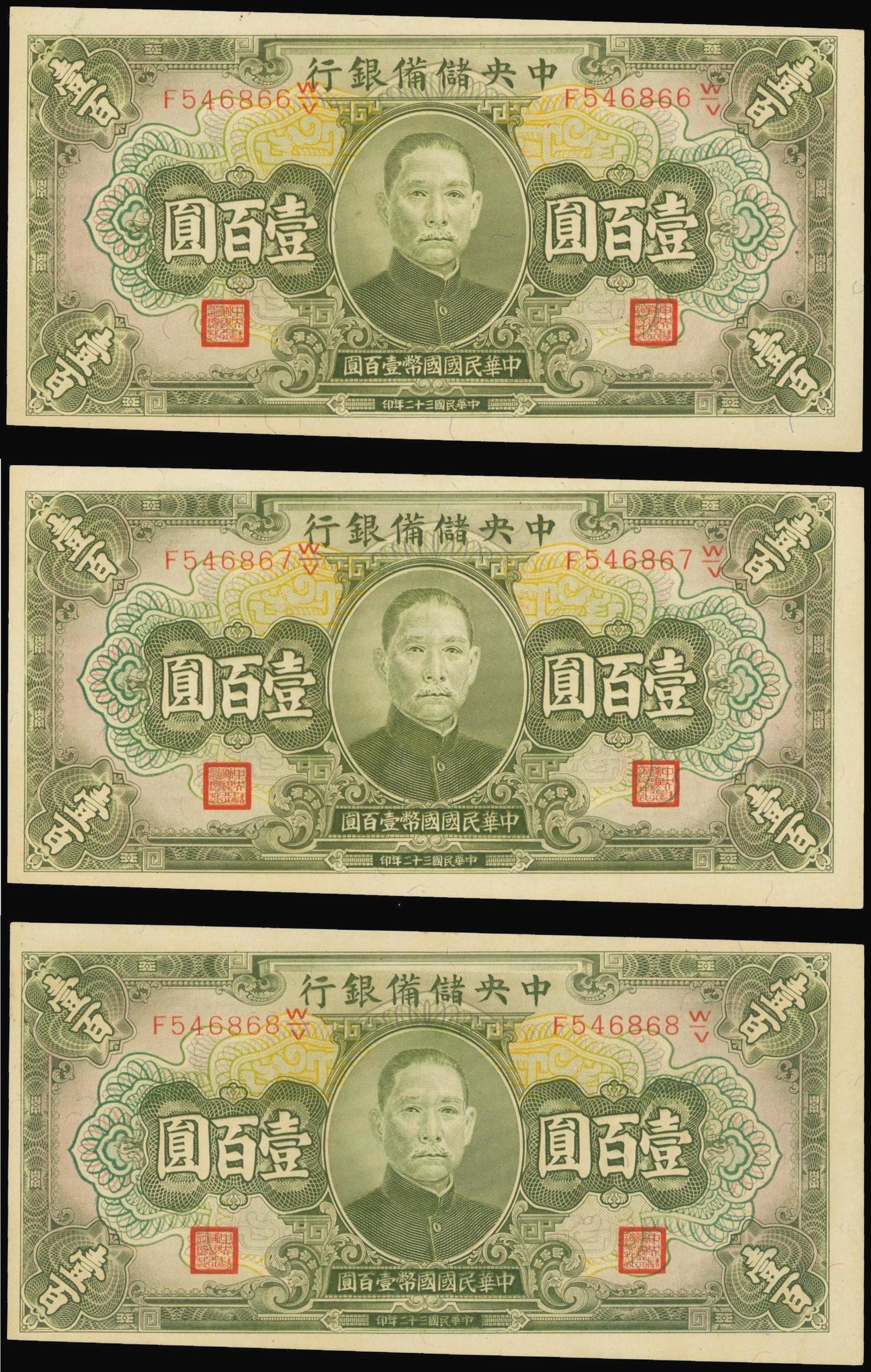The Central Reserve Bank of China,100 yuan, consecutive of 3, 1943, serial number F546866-8,olive on multicolour underprint, Sun Yat Sen at centre,reverse light green, Mausoleum at centre,
