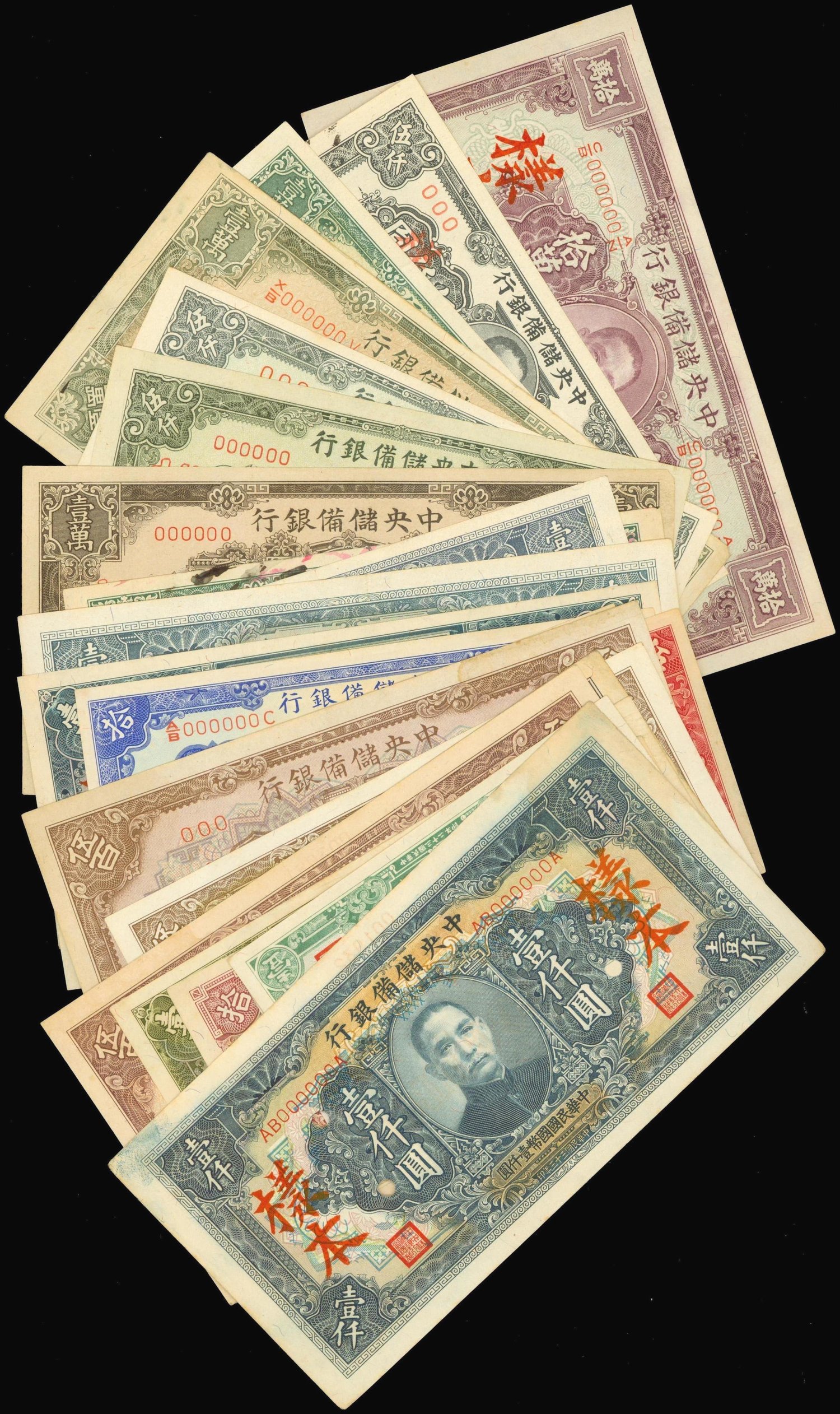 Central Reserve Bank of China,a mixed lot of 27 specimens notes, consisting a 50 cents uniface reverse, 50 cents and 1 yuan uniface obverse and reverse, 1, 5, 10, 100, 500, 1000, 50000 and 10000 yuan, c.1940’s,all different, no duplicate,