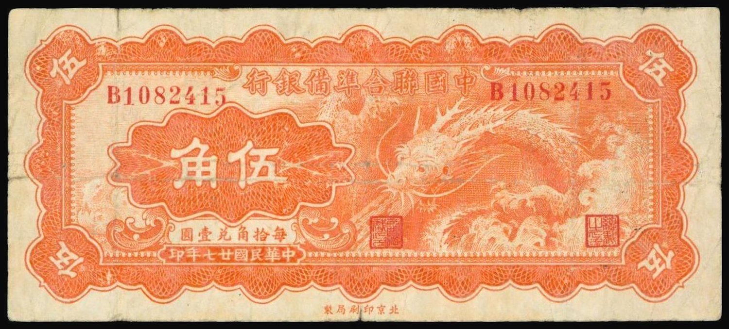 Federal Reserve Bank of China,50 cents, 1938, serial number B1082415,orange, dragon at right, value at left, reverse orange,