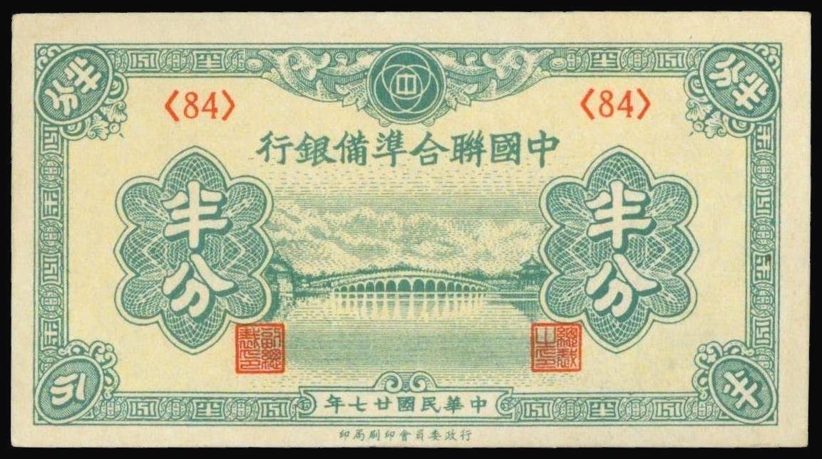 Federal Reserve Bank of China,1/2 fen, 1938, block number 84,light blue-green on yellow underprint, bridge at centre, reverse blue-green, value,