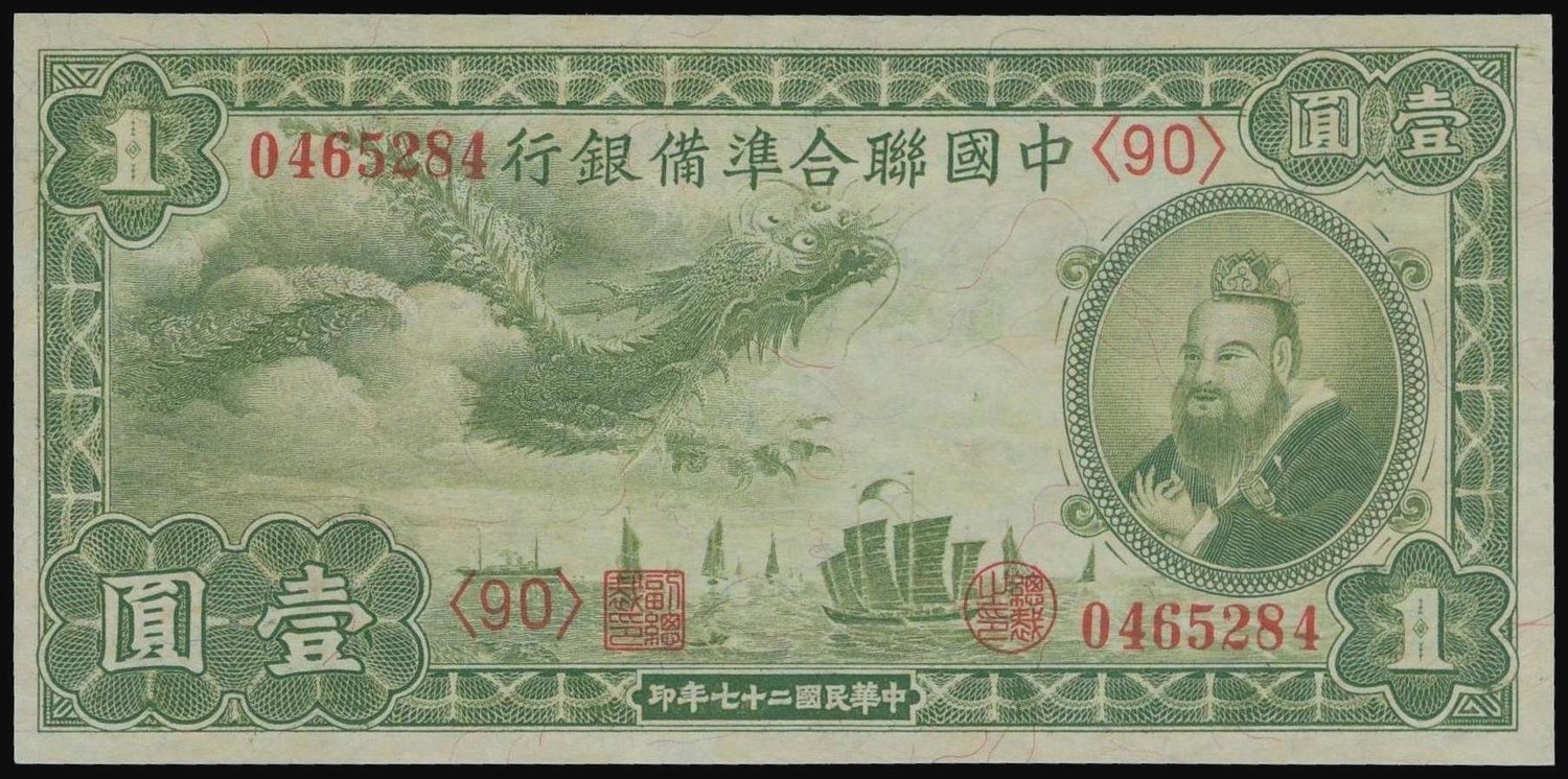 Federal Reserve Bank of China, 1 yuan, 1938, <90> 0465284, dull green, flying dragon at top left, Confucius at right,