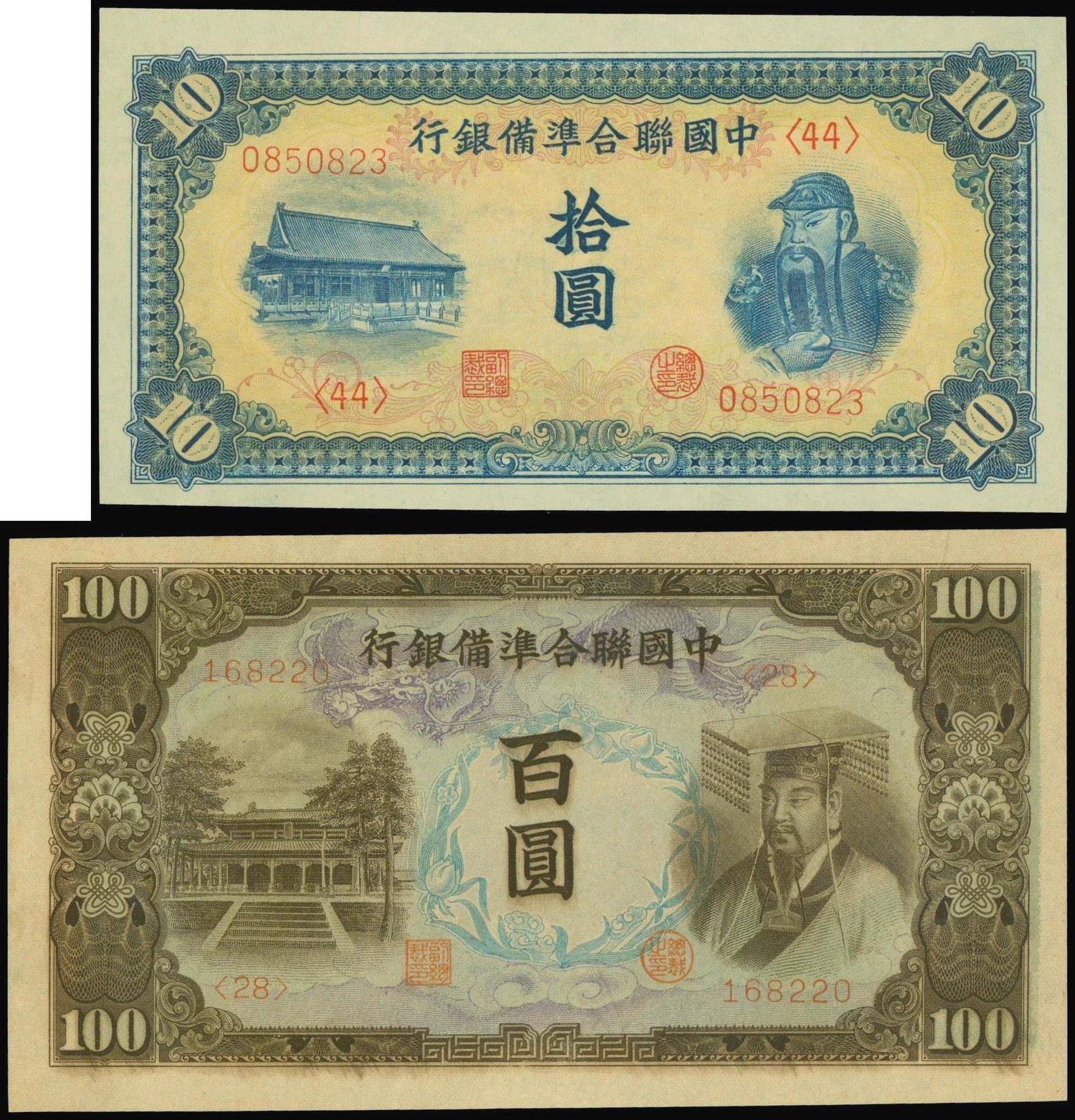 Federal Reserve Bank of China,lot of two 100 yuan,ND(1941 and 44), serial number 0850823, 168220,blue on red orange underprint and black on multicolour underprint respectively,
