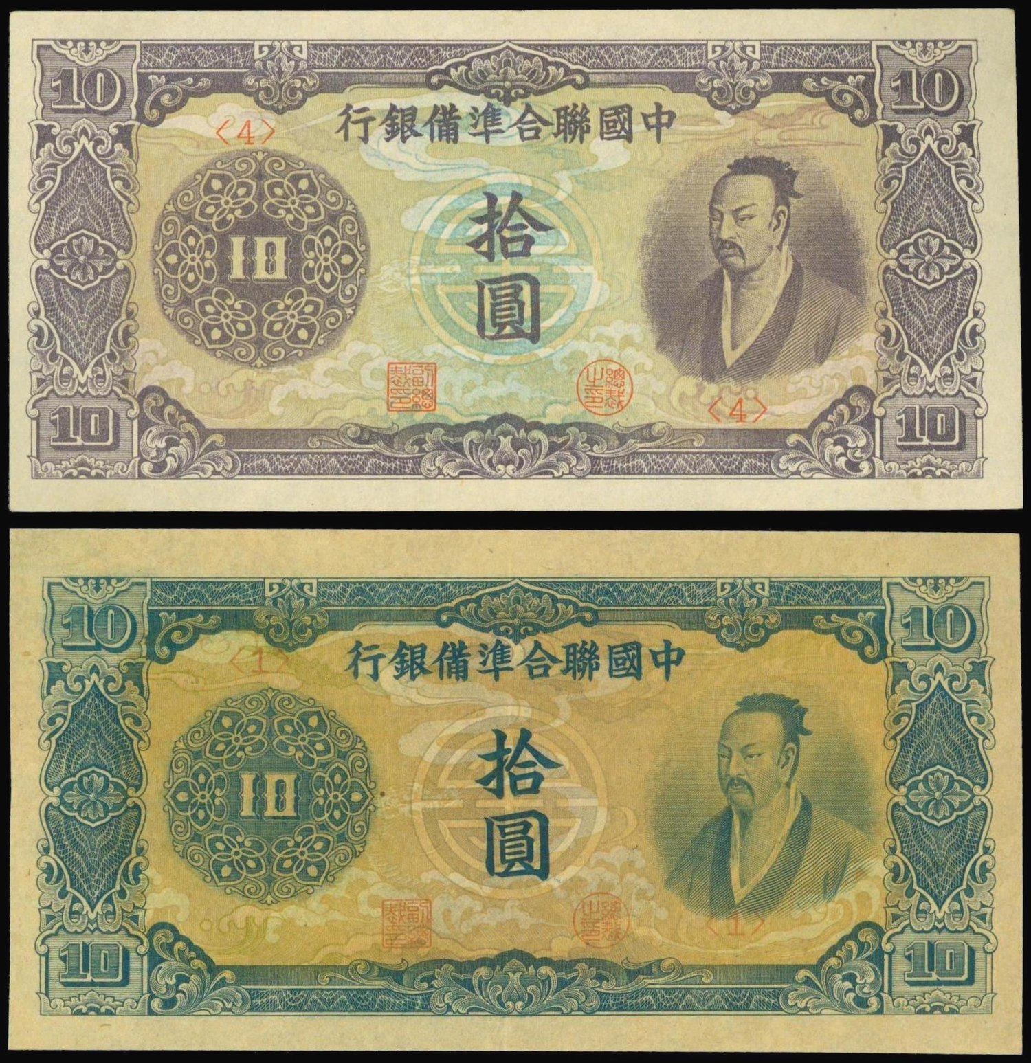 Federal Reserve Bank of China,lot of two 10 yuan,ND(1944),similar design, purple and green on multicolour underprint respectively,