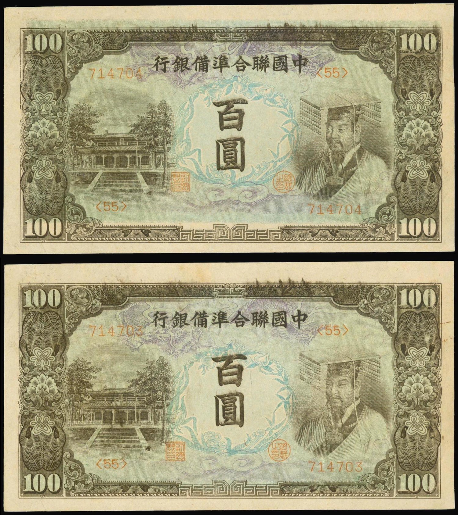 Federal Reserve Bank of China,consecutive pair of 100 yuan, ND(1944), serial number 714703-4,black on green blue, Huang Ti at right, reverse brown,