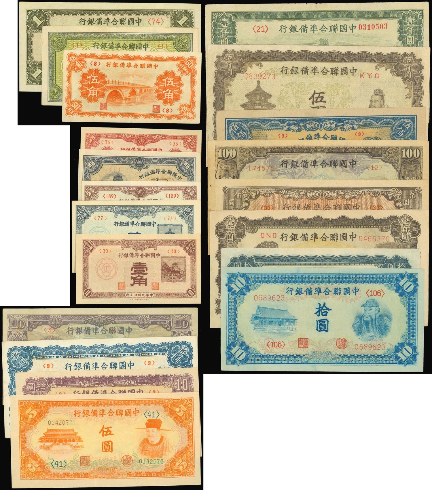 Federal Reserve Bank of China,mixed lot of 20 notes, from 1 cents to 1000 yuan, 1938 or ND,varies colour and design,