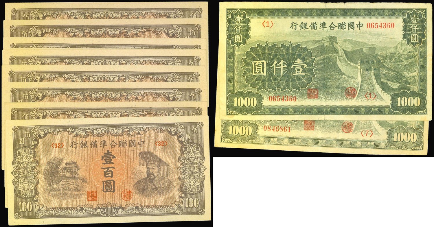 Federal Reserve Bank of China, lot of 12 notes, including, 100 yuan 1945 (10) and 1000 yuan, 1945 (2),