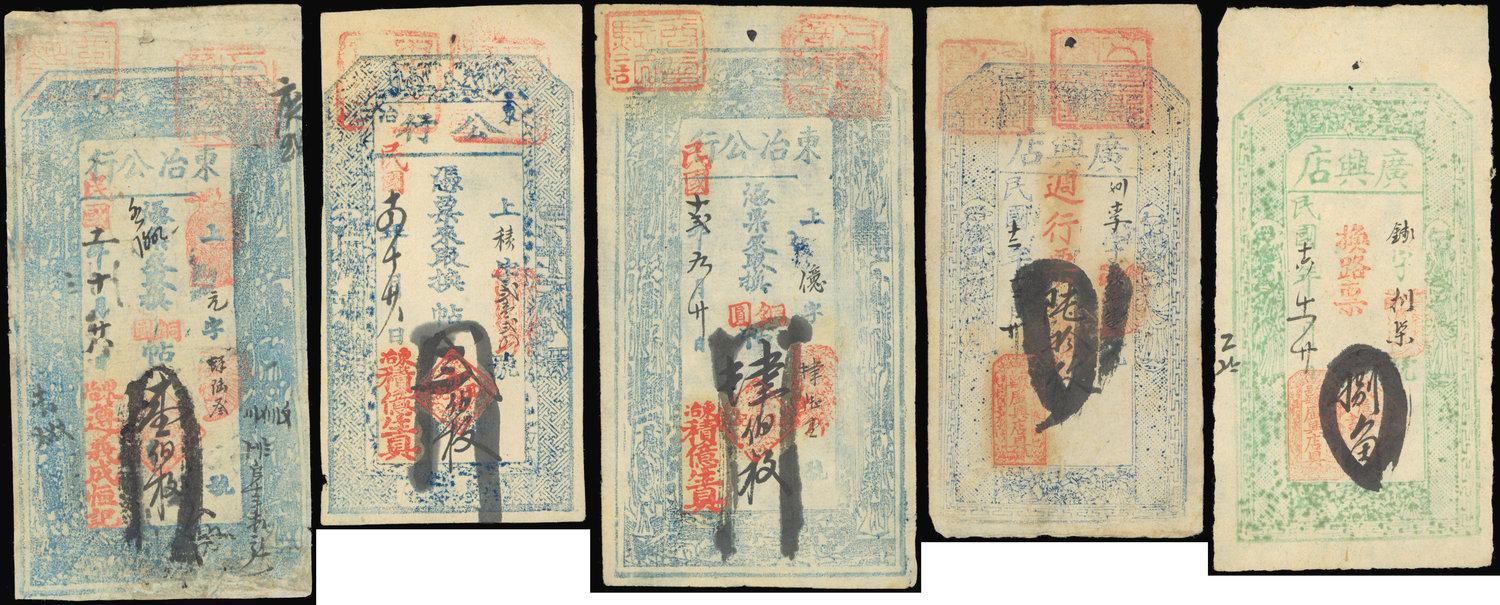 Private Issue,mixed lot of 5 x private issued notes, Republican era,vertical format, blue or green block print on white, red stamps, brush writing,