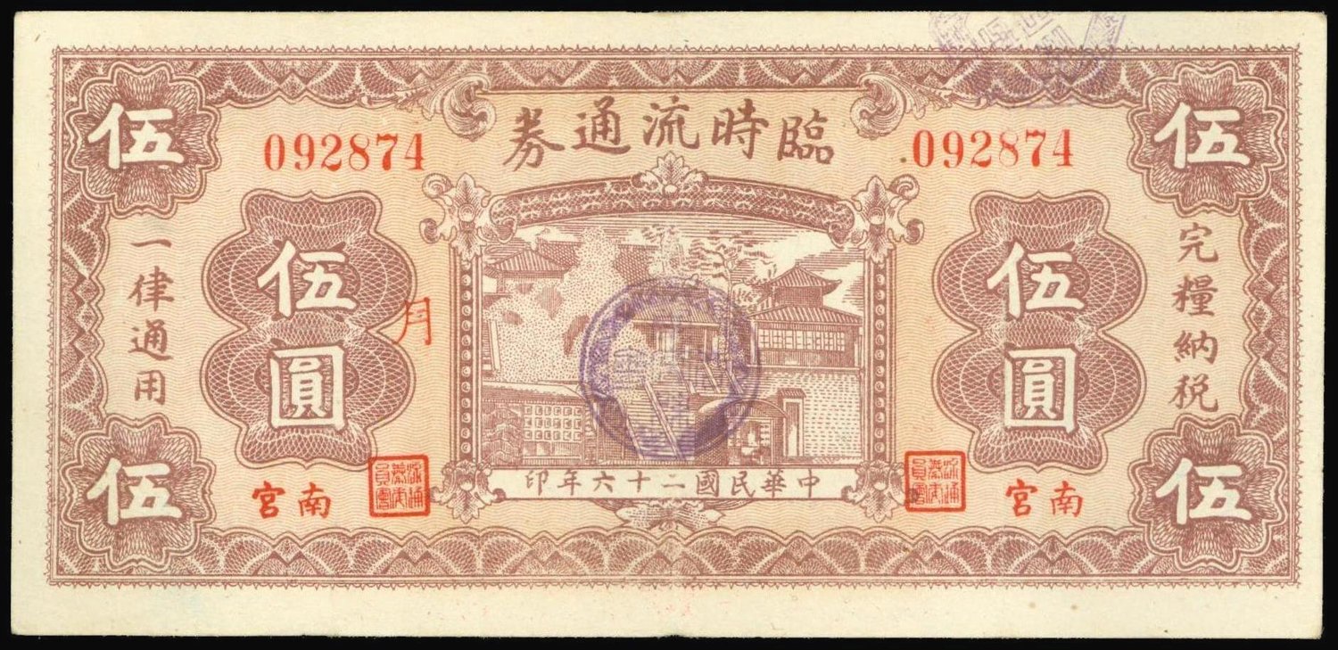 Temporary Issue Note, Nan Gong,5 yuan, 1937, serial number 092874,brown, village building at centre, reverse blue, large squre red chop overprinted,