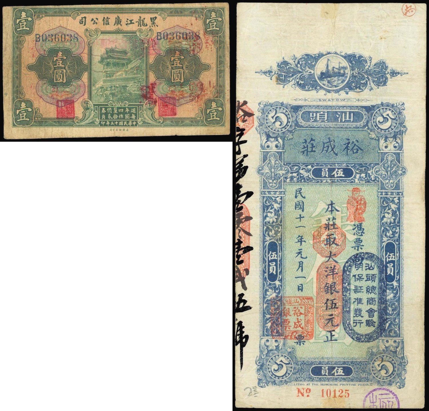 Private Issue, Yee Seng Chong, Swatow,$5, 1922, serial number 10125,vertical format, blue on light green underprint, steam boat at top centre, red stamps, reverse blue, brush writing,