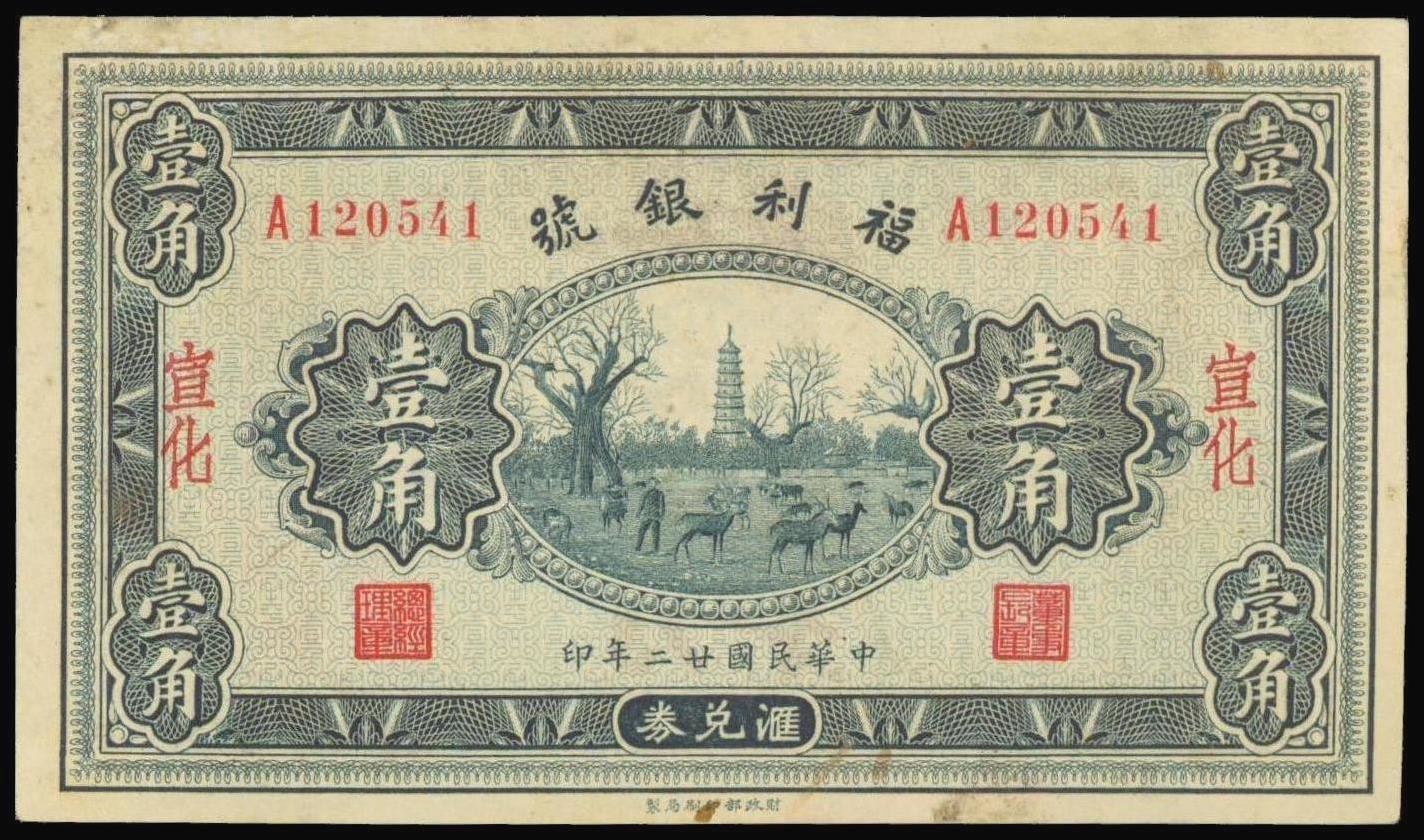 The Foh Lee Bank,10 cents, 1933, Xuan Hua, serial number A120541,green, goats before pagoda at centre, reverse dark green, overprinted red text and signatures,