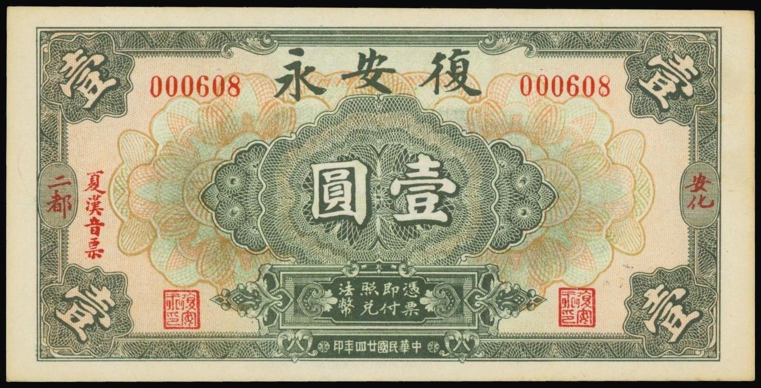 Fu An Yong, Private Bank,$1, 1935, serial number 000608,green on multicolour underprint, value at centre, reverse purple on pale green underprint, building at right in oval frame,