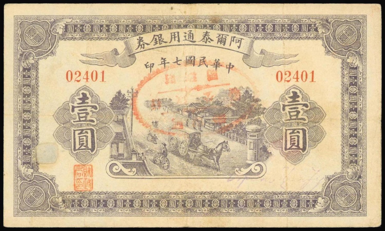 Altai District, Current Silver Note,1 yuan, 1918, serial number 02401,grey-violet, horse drawn wagon with people at centre, reverse green,