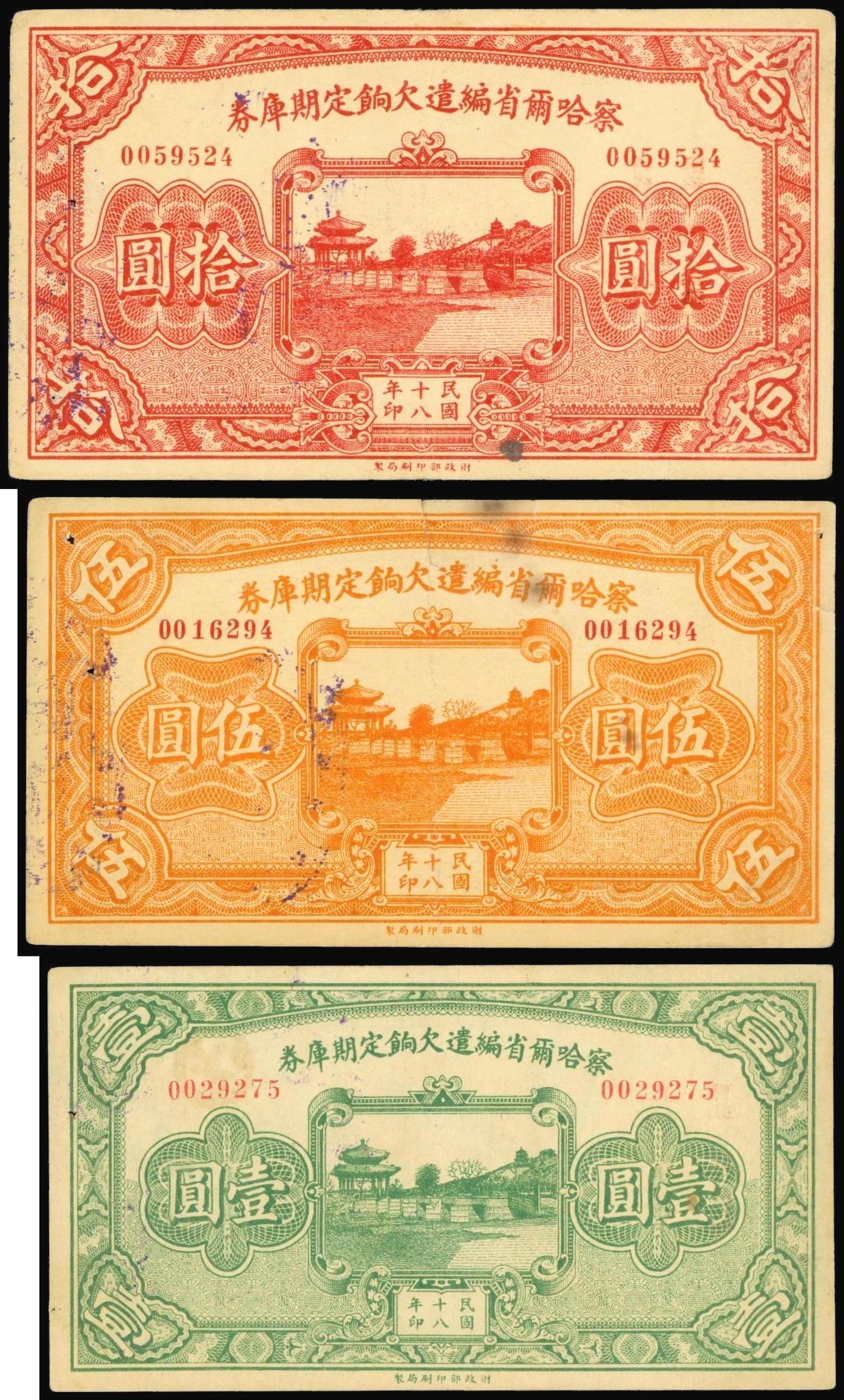 Chahar Province,a lot of 1, 5 and 10 yuan fixed term treasury notes, 1929,green, orange and red respectively, similar design, gazebo and bridge at centre,