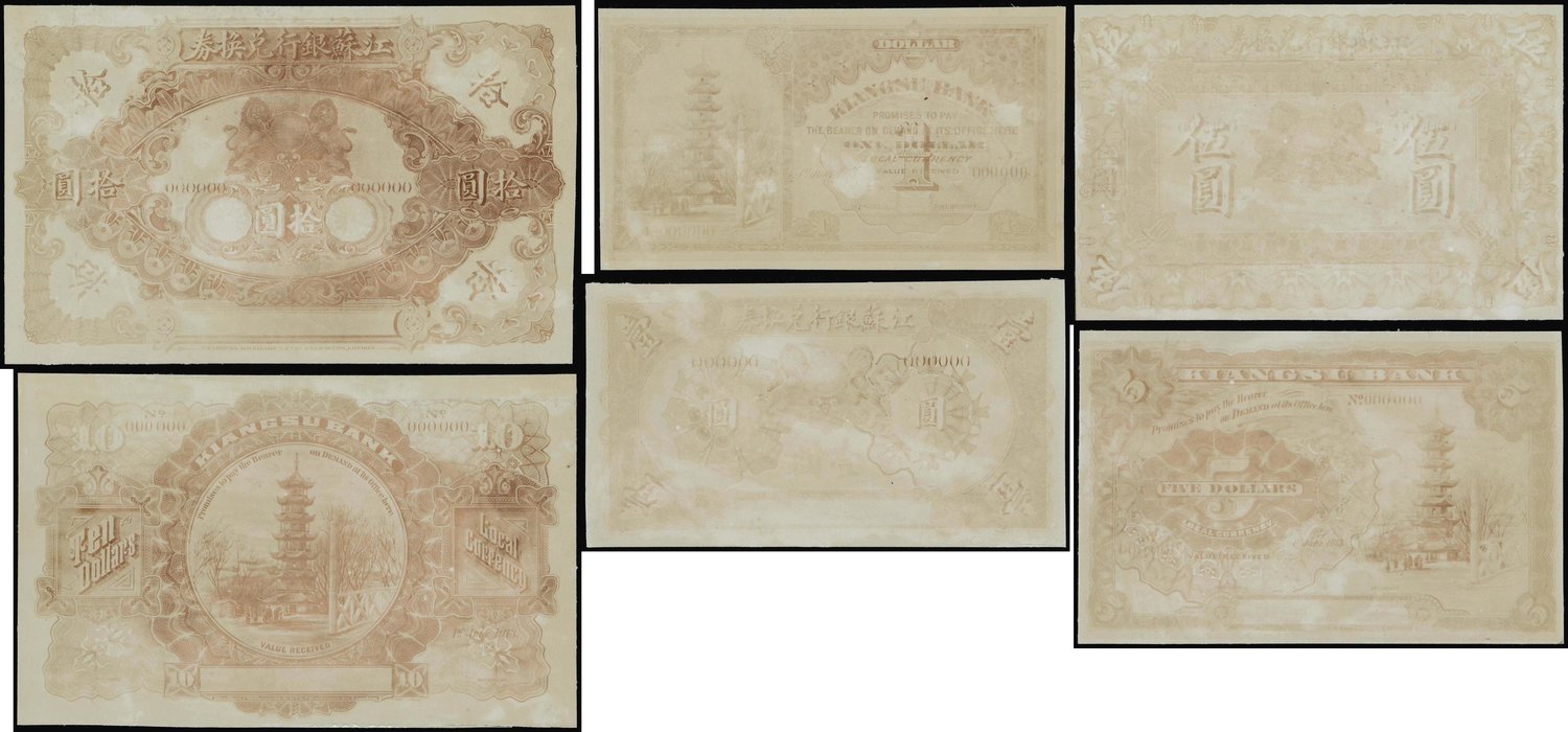 Kiangsu Bank, set of archival photgraphic proofs for $1, $5 and $10, 1913, uniface obverse and reverse pairs,