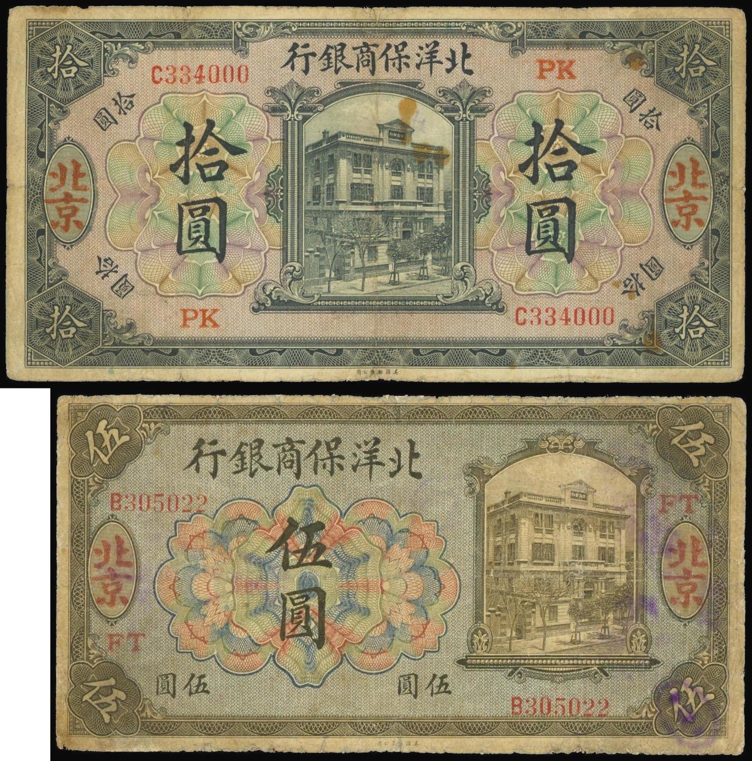 The Commercial Guarantee Bank of Chihli,$5 and $10, 1919, Peking, serial number B305022, C334000, green on multicolour underprint, bank building at right and centre respectively, reverse value,