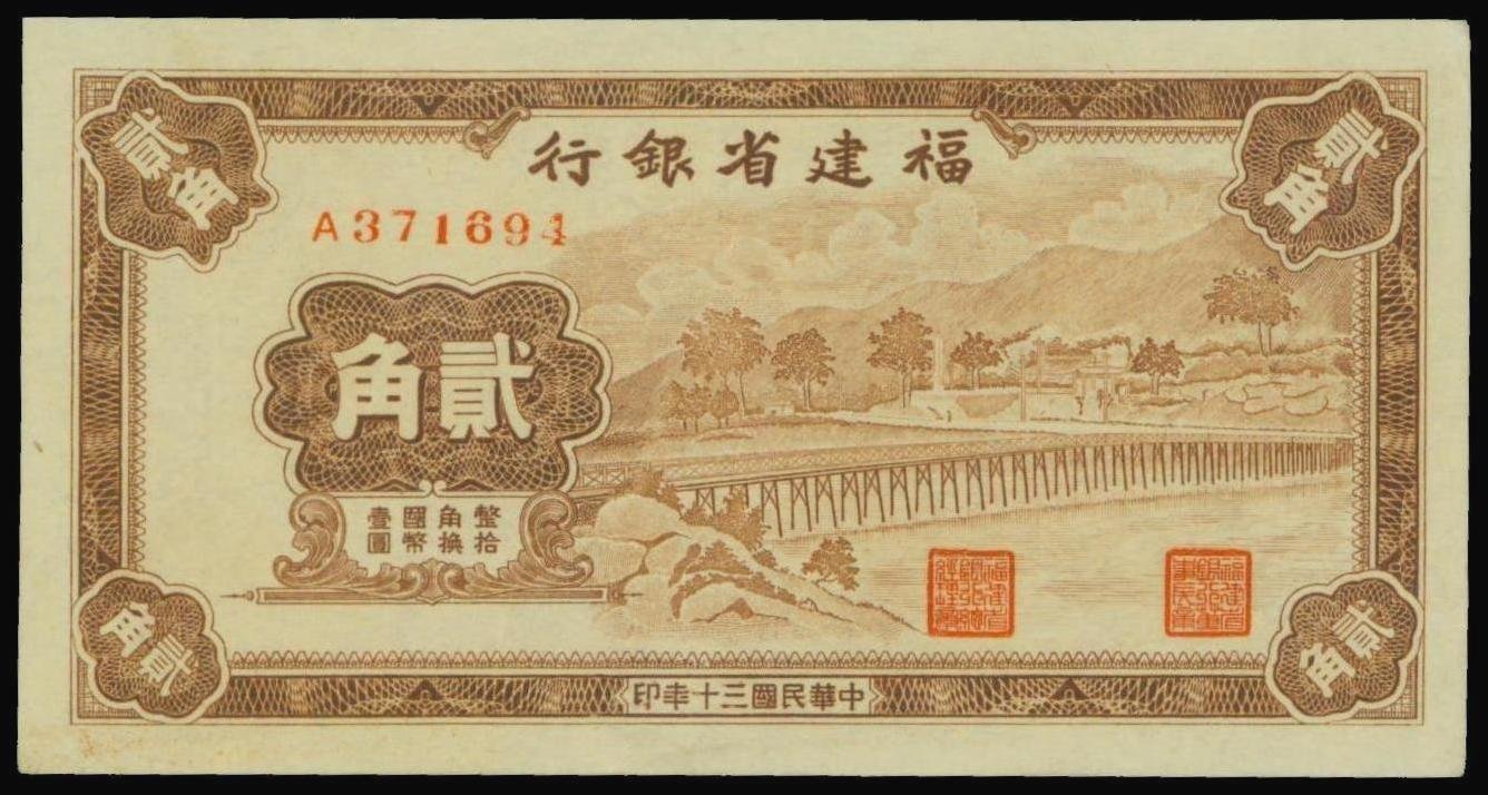Fukien Provincial Bank,2 chiao, 1940-41, serial number A371694,brown, bridge and village view at right, value at left, reverse brown,,
