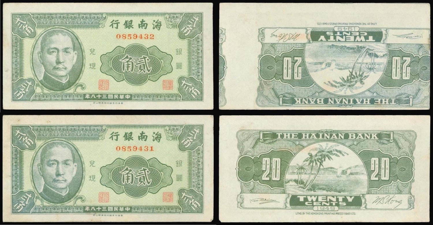 The Hainan Bank,consecutive pair of 20 cents, 1949, one ‘error’ on reverse, the other normal issue,green, Sun Yat Sen at left, reverse green, one printed upside down and shifted to left,