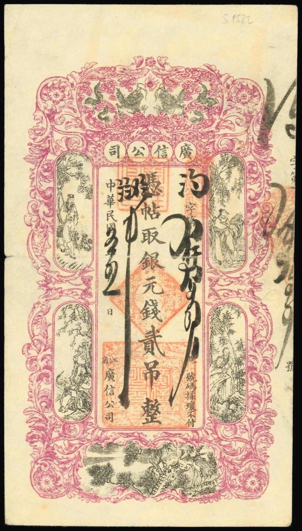 Heilongjiang Kwang Sing Company, 2 tiao, handwritten date and serial numbers, vertical format, purple-pink and black, facing dragons at top, Chinese traditional artwork border, red handstamps, reverse blue, Chinese and Manchu text,