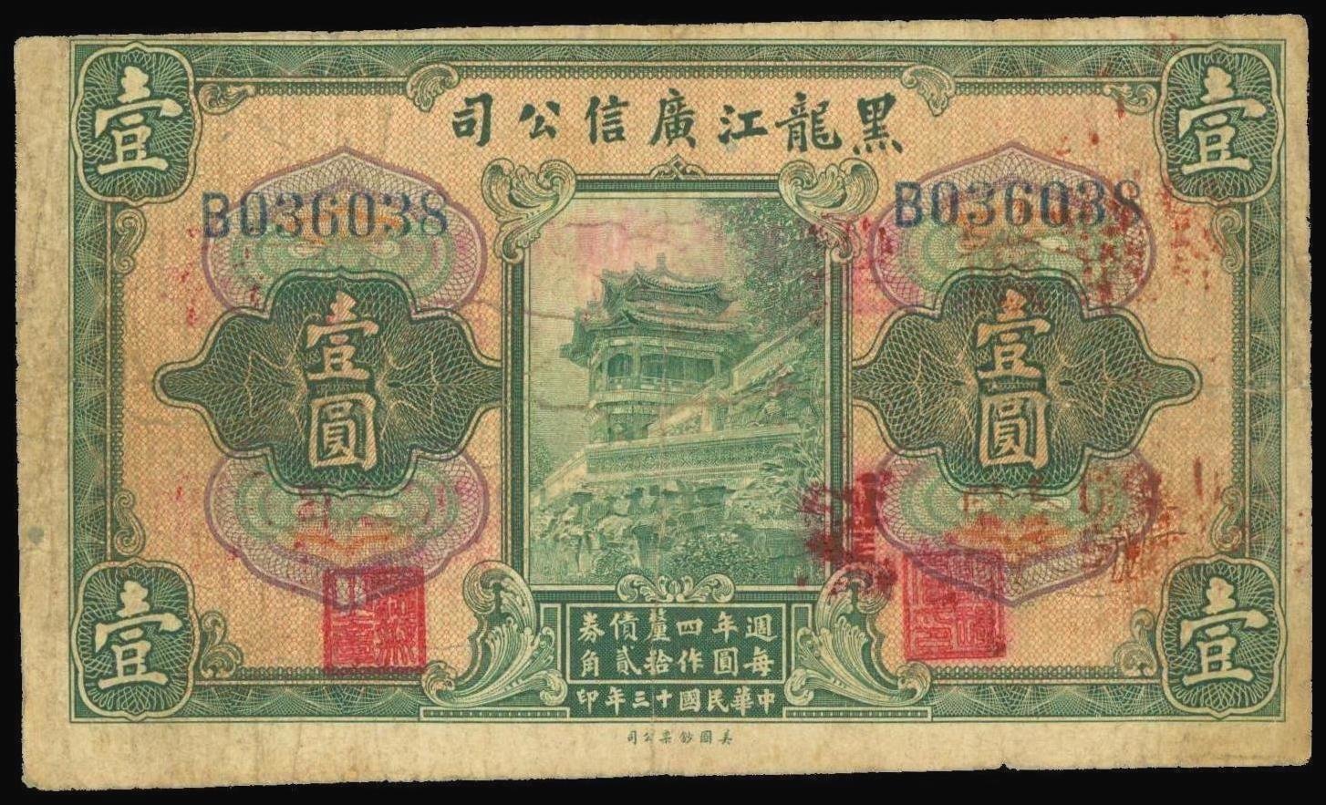 Kwang Sing Company,1 yuan, 1924, red overprinted 1 yuan equals to 120 tiao, serial number B036038,green and multicolour, temple at centre, reverse green, red overpinted Chinese characters and arabic numbers,