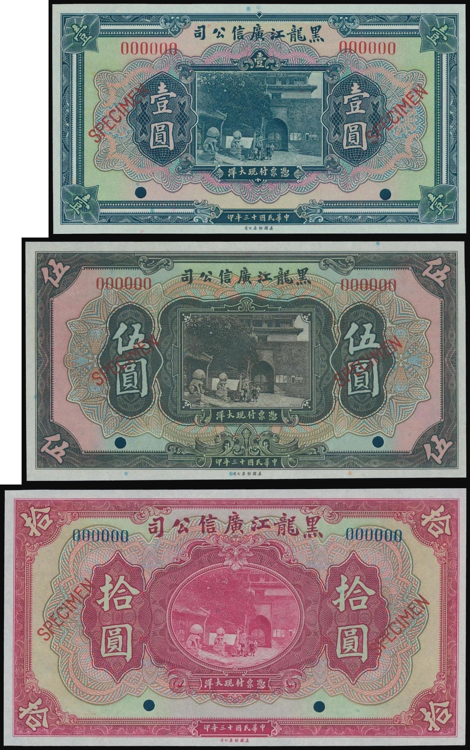 Kwang Sing Company, specimen set of 3 containing $1, $5 and $10, Heilungchiang, 1924, grey green, brown and red, stone city gate and lion statues at centre,