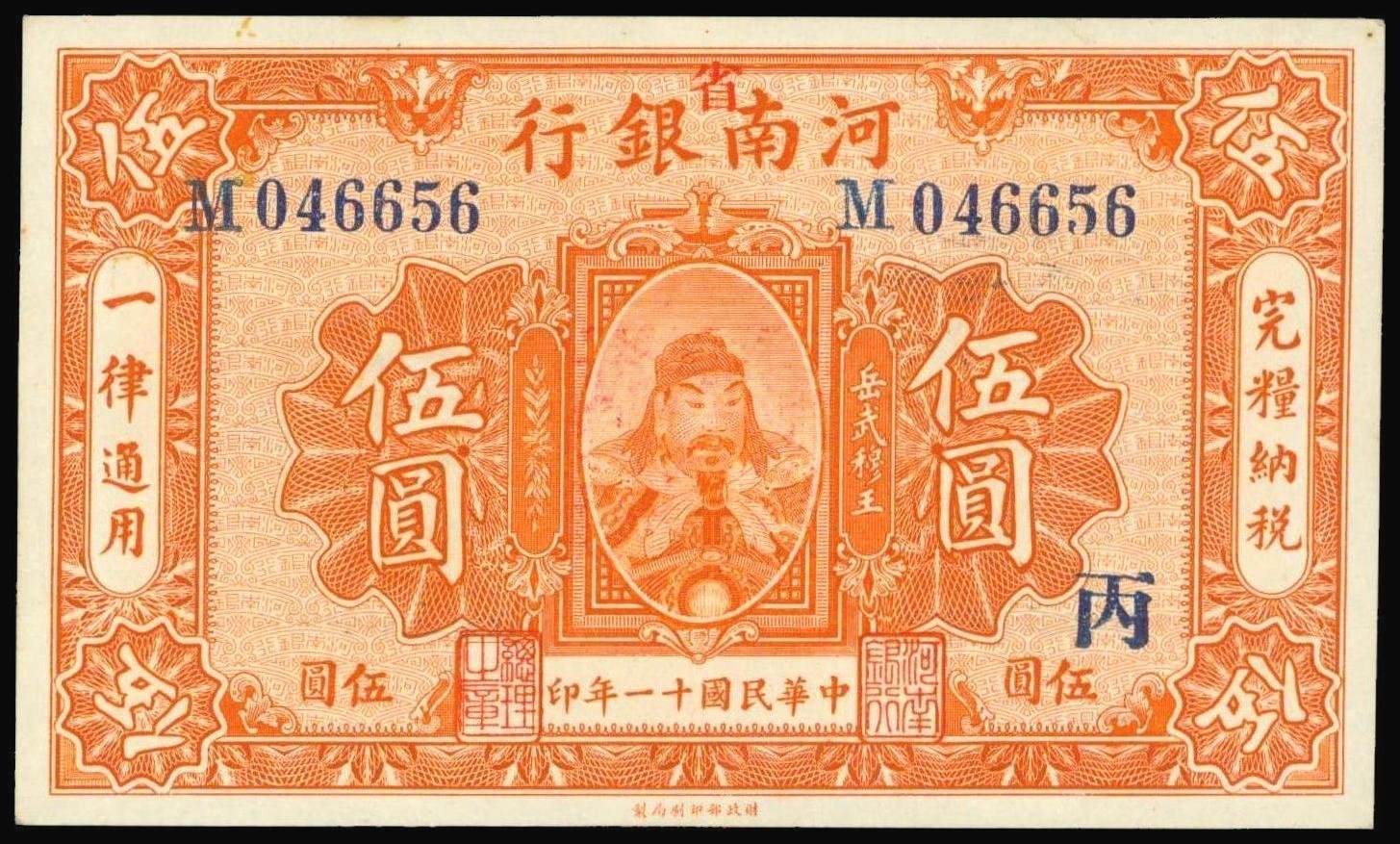 Provincial Bank of Honan,5 yuan, 1922, serial number M046656,orange, Yue Fei at centre, reverse red brown and multicolour, red seal overprinted at centre,
