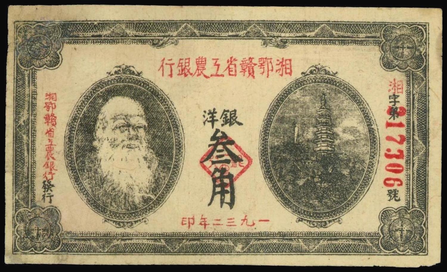 Hunan-Hupei-Kiangsi Workers and Farmers Bank,3 chiao, 1932, serial number 217306,black, old man at left, pagoda at right, value at centre, reverse brown-violet, view of village at centre,