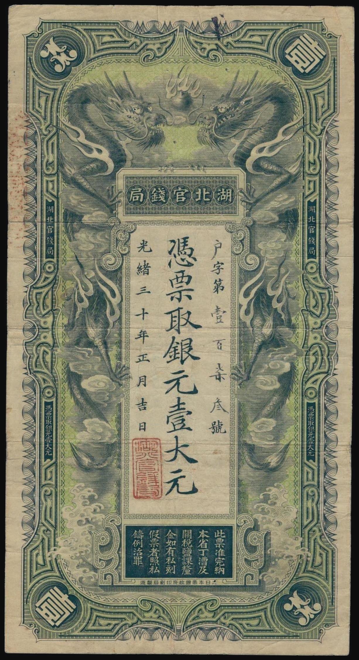 Hupeh Government Cash Bank, $1, 1904, serial number 173, vertical format, black on green, facing dragons and fireball at top centre, reverse orange, black Chinese text,