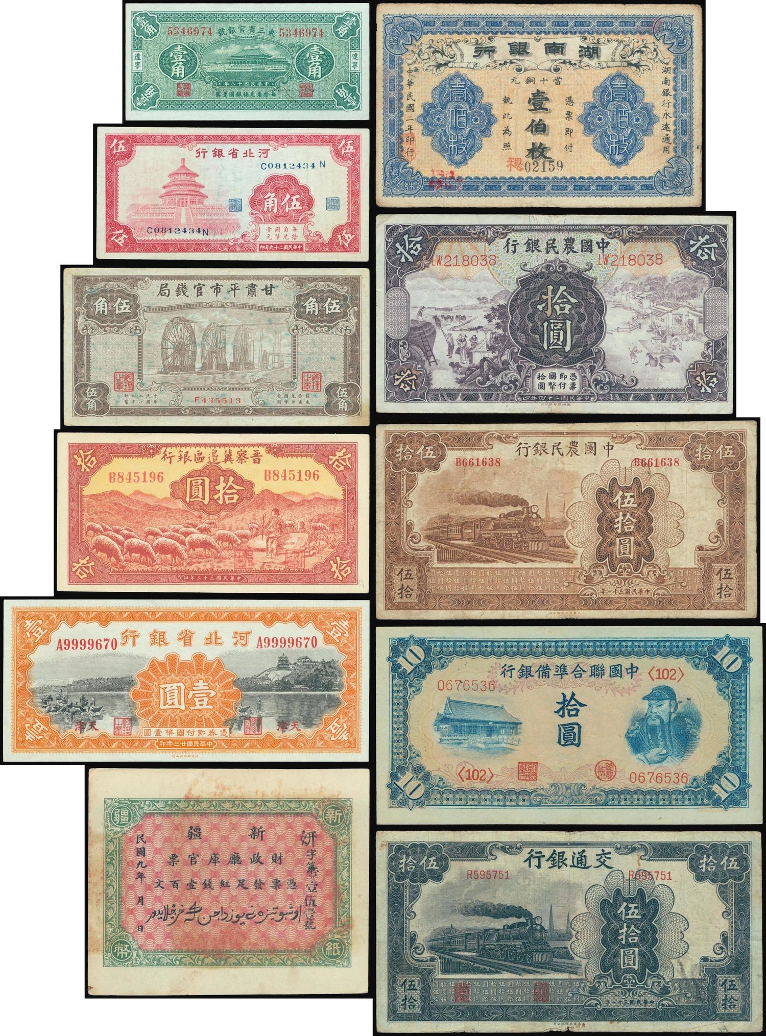 Provincial banknotes from the republican era, group of 11 notes, some better types seen, Bank of Hopei 5 jiao, 1940 and 1 yuan, 1934, Bank of Hunan 100 coppers, 1913 and Bank of Shansi Chahar and Hopei, 10 yuan, 1943, etc,