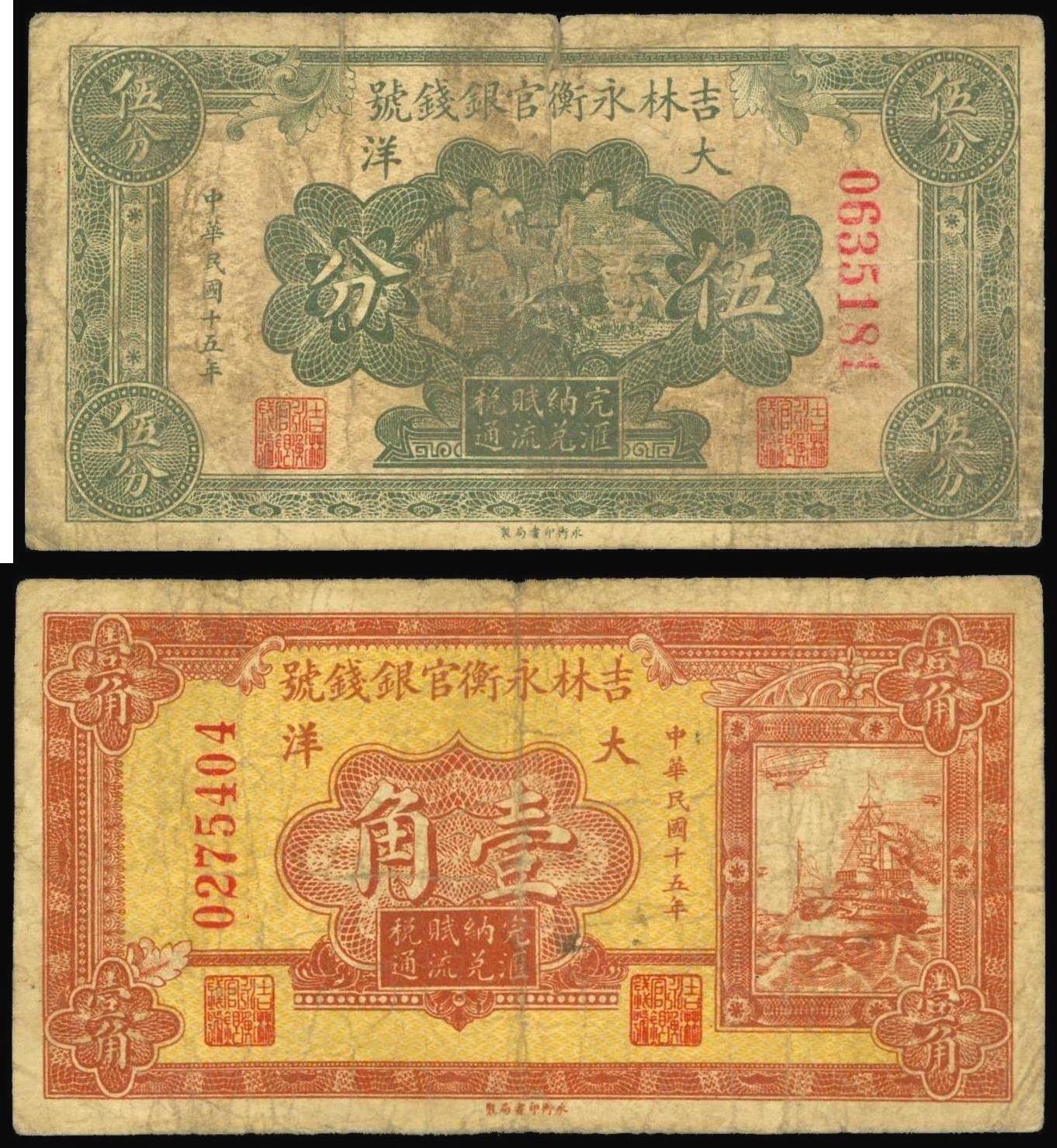 The Yung Heng Provincial Bank of Kirin,5 and 10 cents, 1926,green and pink, red and yellow respectively, small notes,