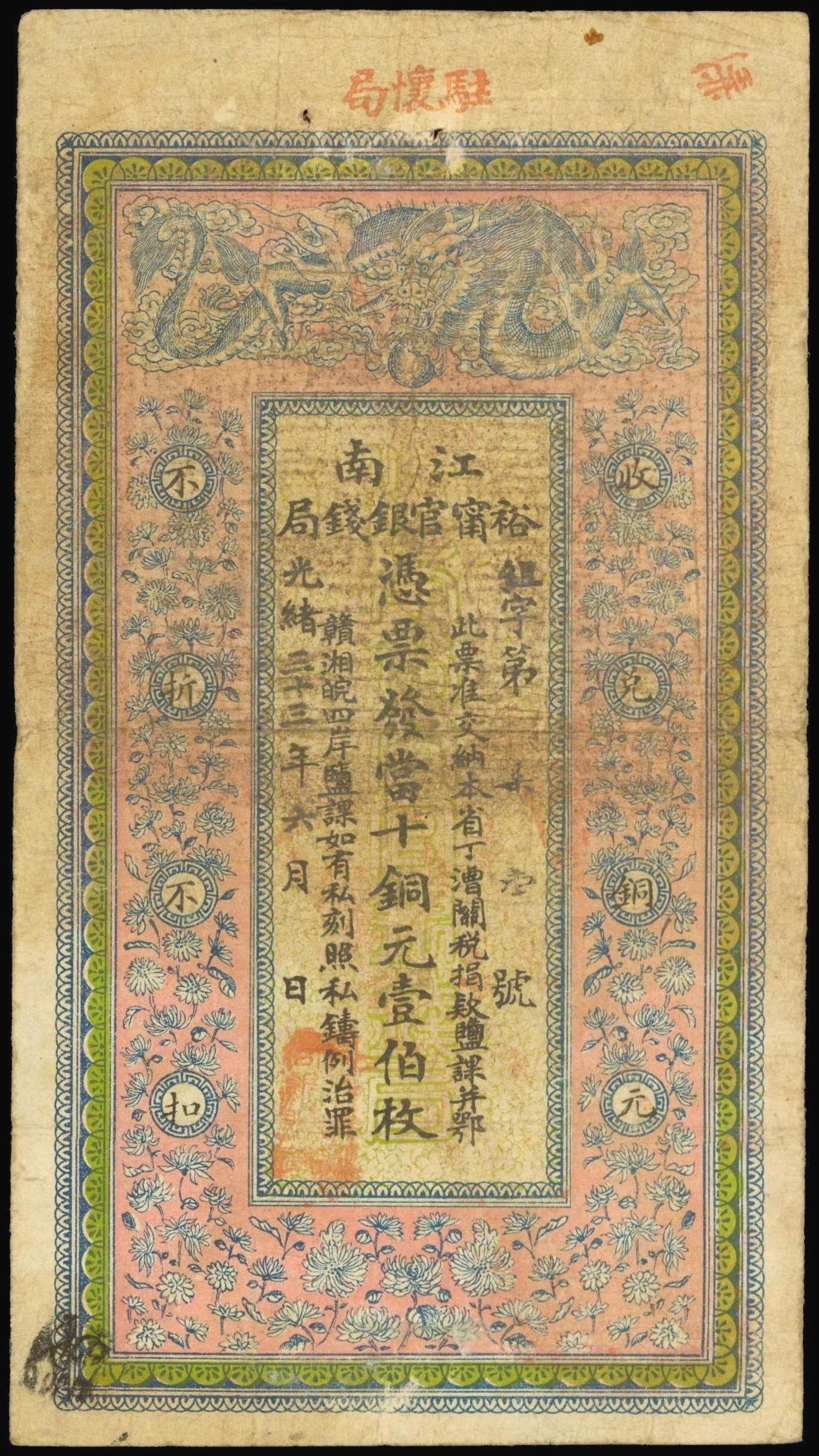 Kiangnan Yu Ning Government Bank,100 coppers, 1907,vertical format, blue, green and pink, ornate floral border, dragon top centre, reverse black Chinese text, large red chop,