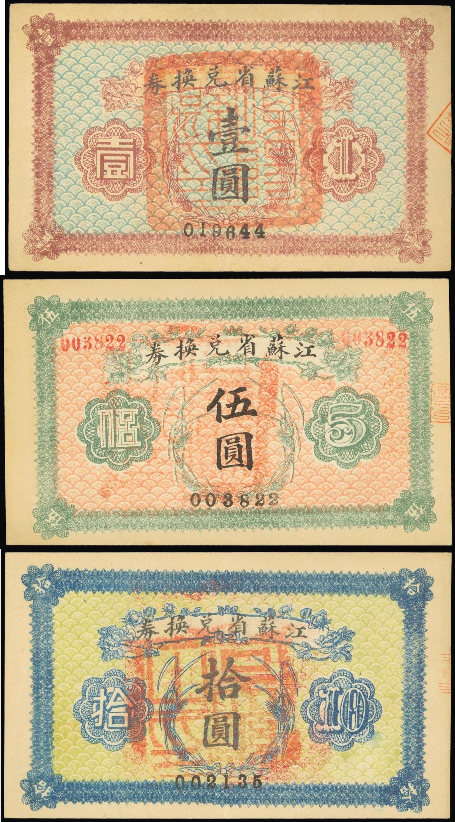 Kiangsu Province, Exchange Note,1, 5, 10 yuan, ND, serial number 019644,003822, 002135,brown on light blue, green on orange, dark blue on pale green respectively,