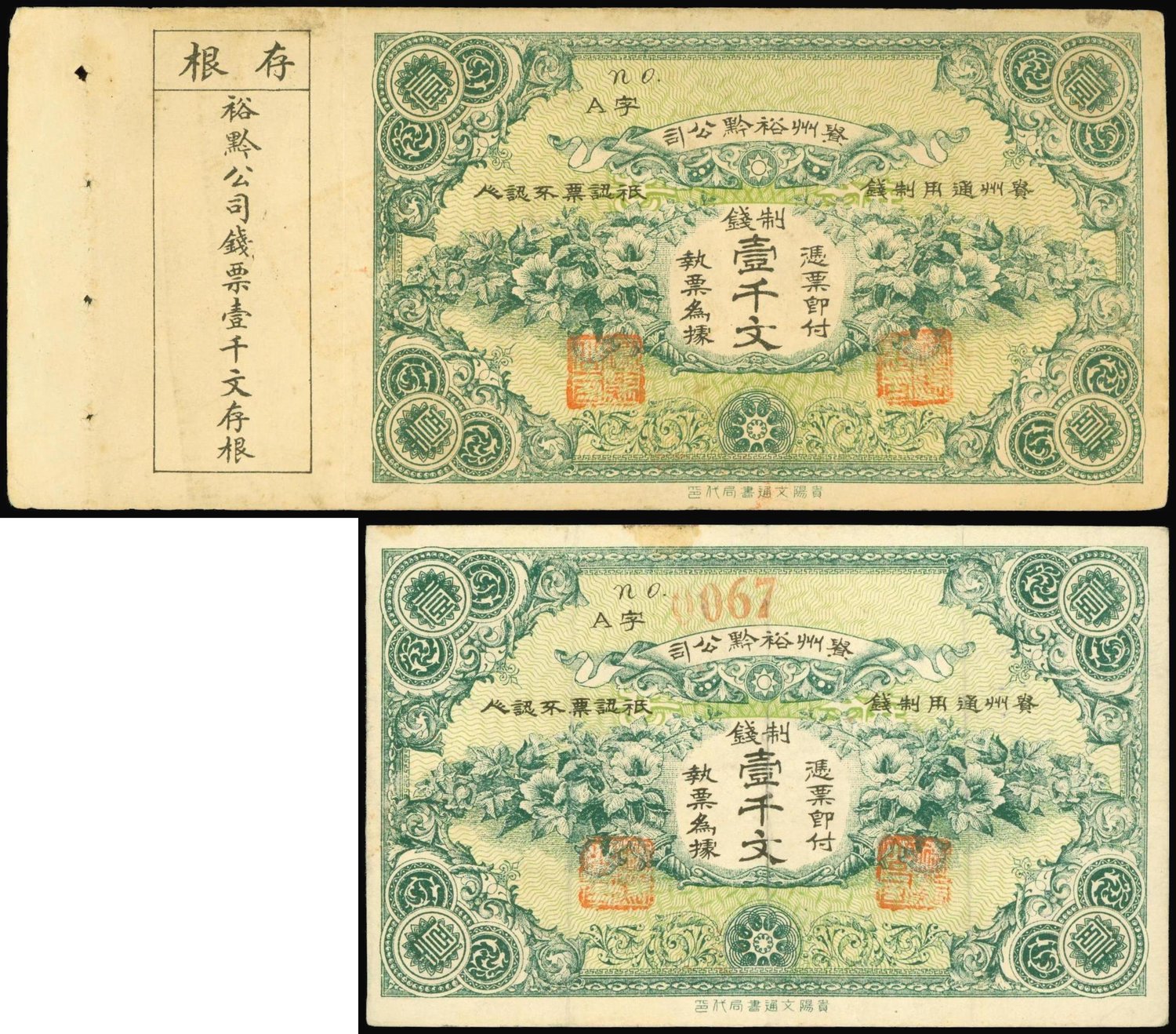The Juchien & Co., Kweichow,a lot of two 1000 cash, one issued note and one remainder, ND,green, value at centre, floral pattern, reverse brown on yellow underprint, steam train at centre,