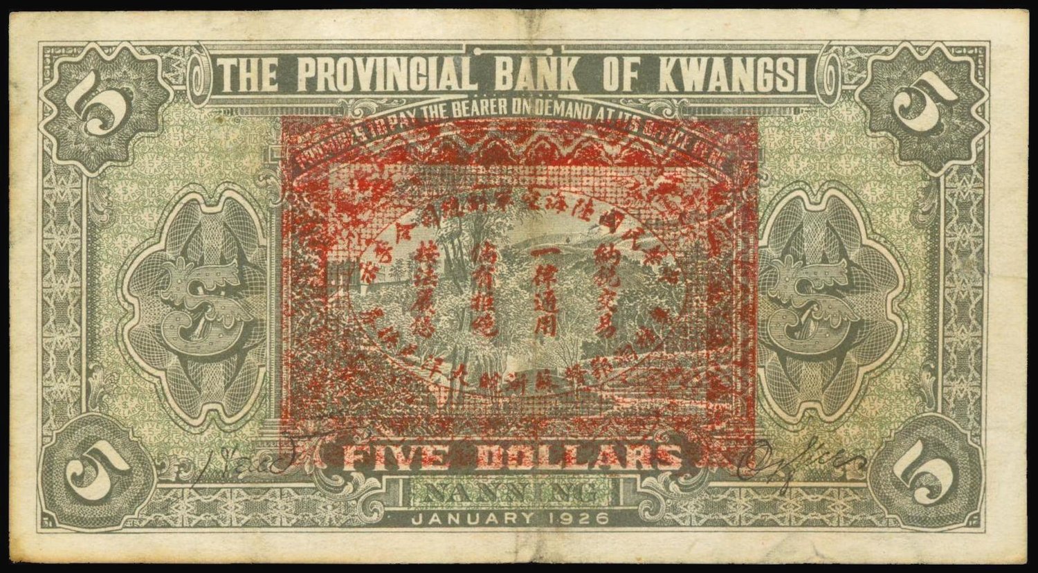 The Provincial Bank of Kwangsi,5 yuan, 1926, Nanning, serial number A1163660,blue on red underprint, landscape left and right, reverse black, large red chop overprinted,