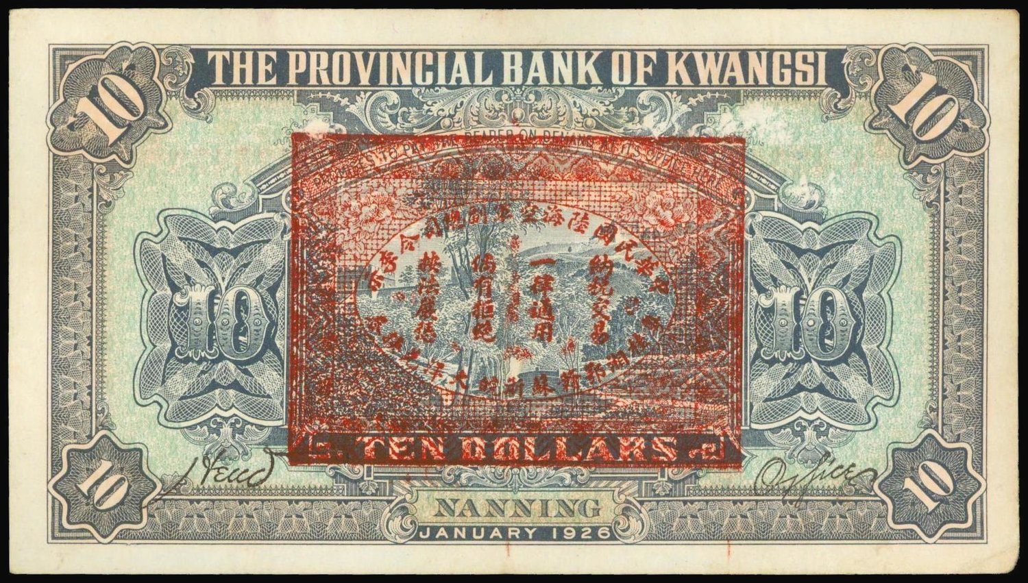 The Provincial Bank of Kwangsi,10 yuan, 1926, Nanning, serial number A425473,brown on grey green underprint, landscape left and right, reverse grey green, large red chop overprinted,