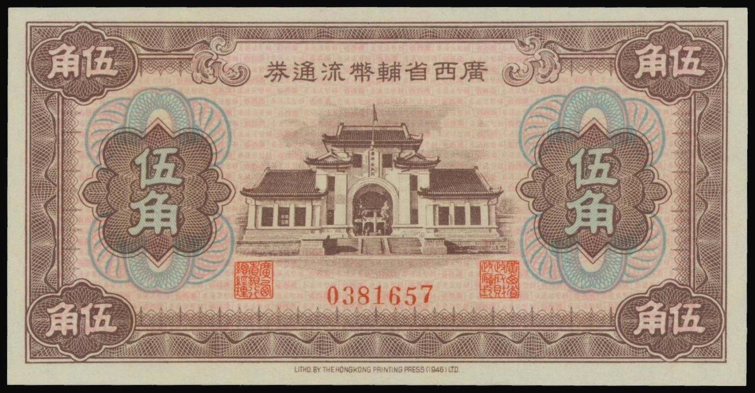 Kwangsi Provincial Government,50 cents, ND(1949), serial number 0381657,brown and light blue, government building at centre, reverse brown, value,