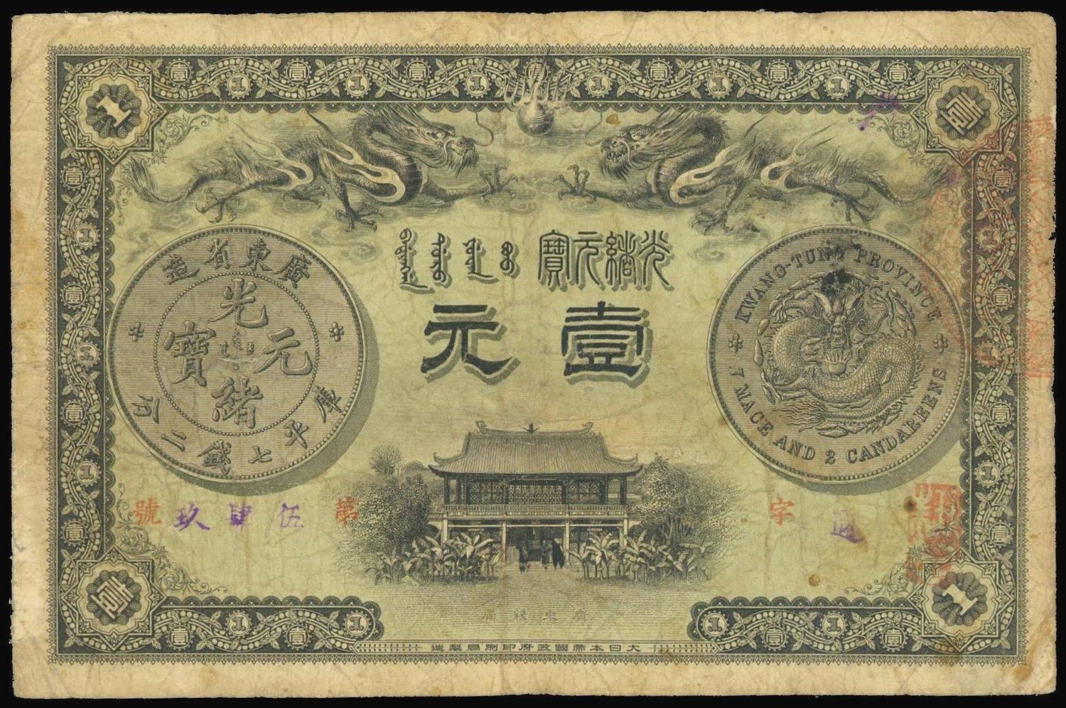 Kwangtung Currency Bureau,$1, 1905, serial number 549,black and green, two ornate and well detailed dragons chasing fireball at top, reverse and obverse of a Kwangtung silver dollar left and right, Chinese house at bottom, reverse purple Chinese text on white,