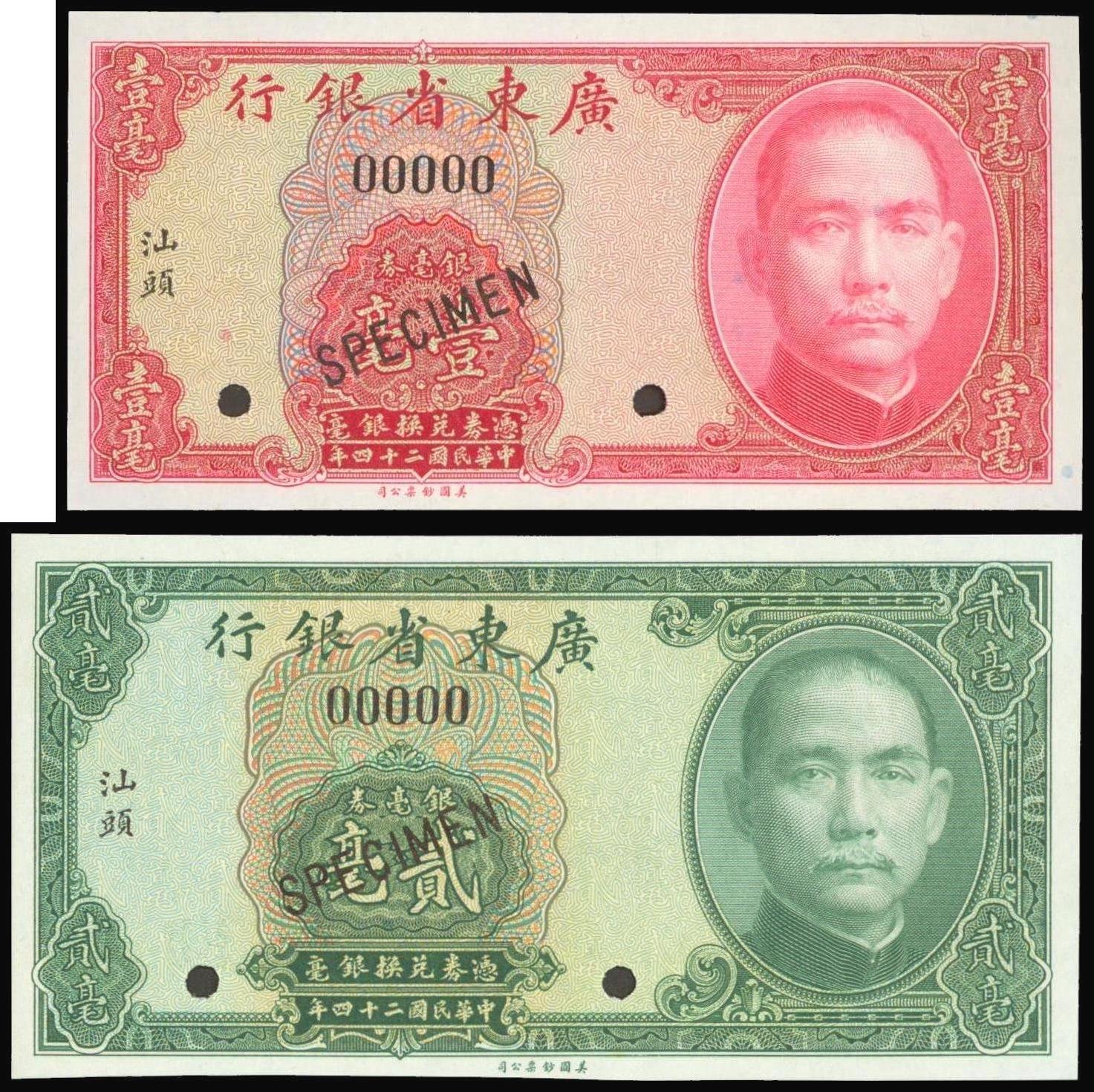 The Kwangtung Provincial Bank,1 jiao and 2 jiao specimens, 1935, ‘Swatow’,red, green on multicolour underprint, Sun Yat Sen at left, reverse red and green respectively, junks at centre,