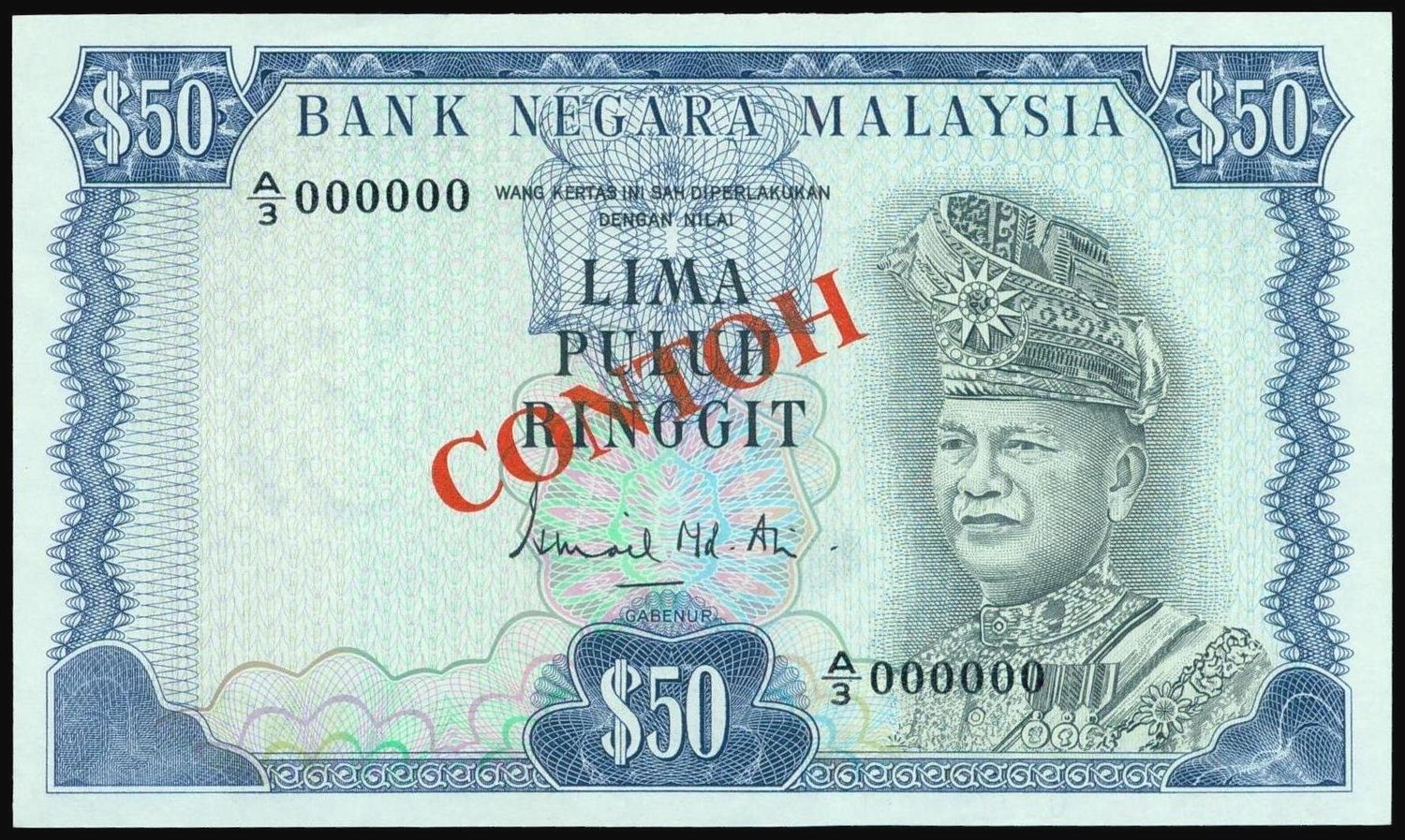 Malaysia, 50 ringgit, specimen, 1st series type 3 (1976-1981), serial number A/3 000000, blue on multicolour, T.A. Rahman at right, arms on reverse,