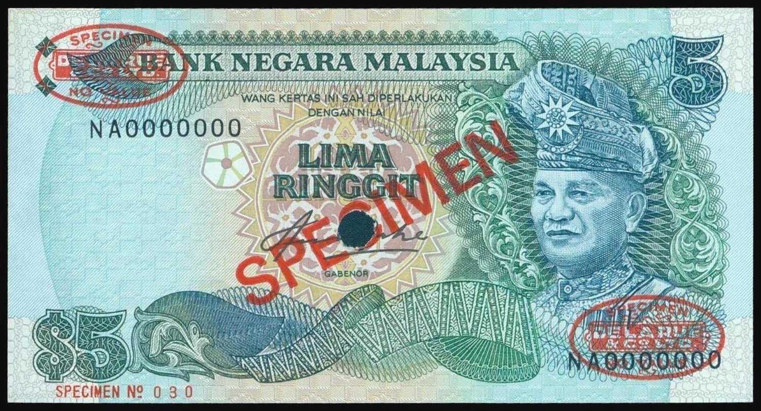 Malaysia, 5 ringgit, specimen, 2nd series type 1 (1981-1983), serial number NA0000000, dark green and blue on multicolour, T.A. Rahman at right, the reverse shows the King's Palace in Kuala Lumpur,