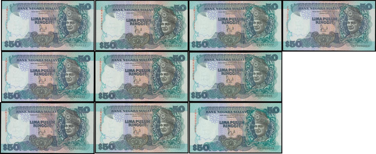 Malaysia, 50 ringgit, 2nd series type II, a near complete set of lucky numbers from ZN 1111111 to 9999999 and 10000000, black, blue on multicolour, T.A. Rahman at right, National Museum in Kuala Lumpur reverse,